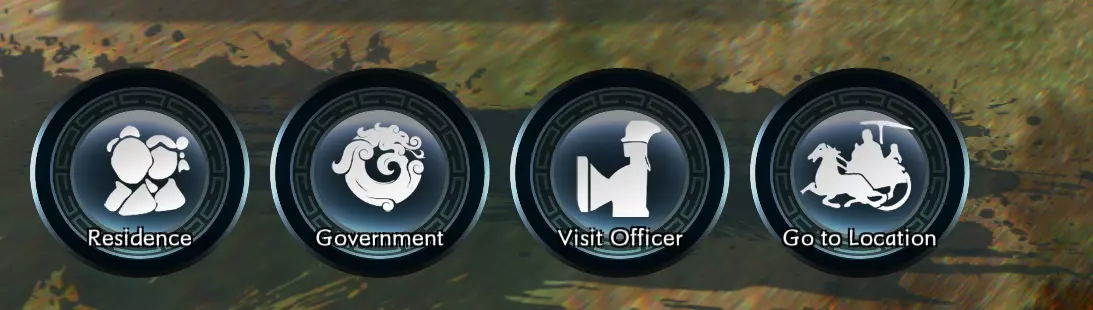 这是内政区域的文武标签页。在此区域,你需要为以下四个白色高亮选项之一指派你的官员: 【治安】:提升公共秩序 【巡逻】:提升民众支持度 【探索】:发现新官员、物品和黄金 【城防】:指派官员在特定地点驻守防御城市