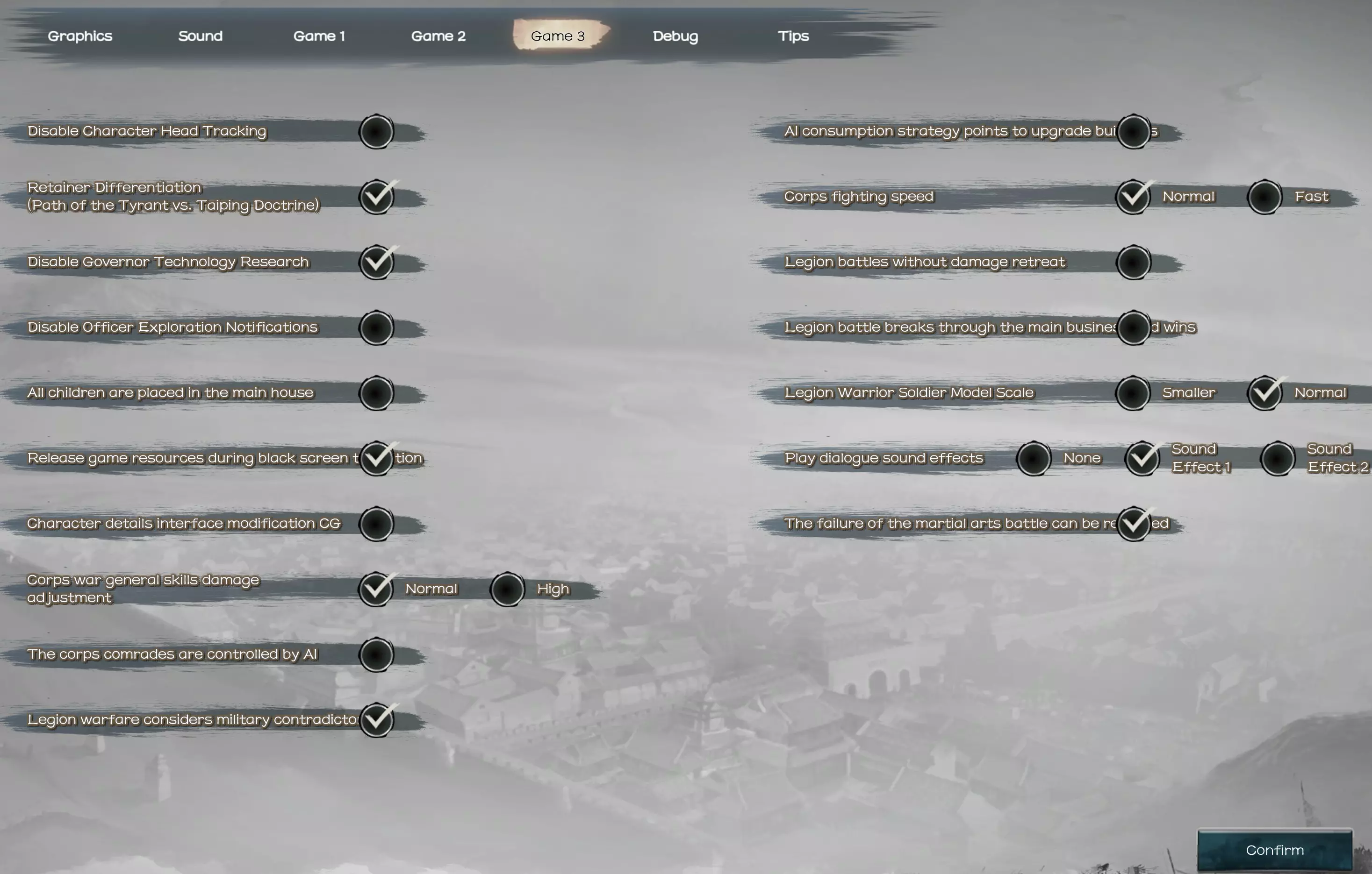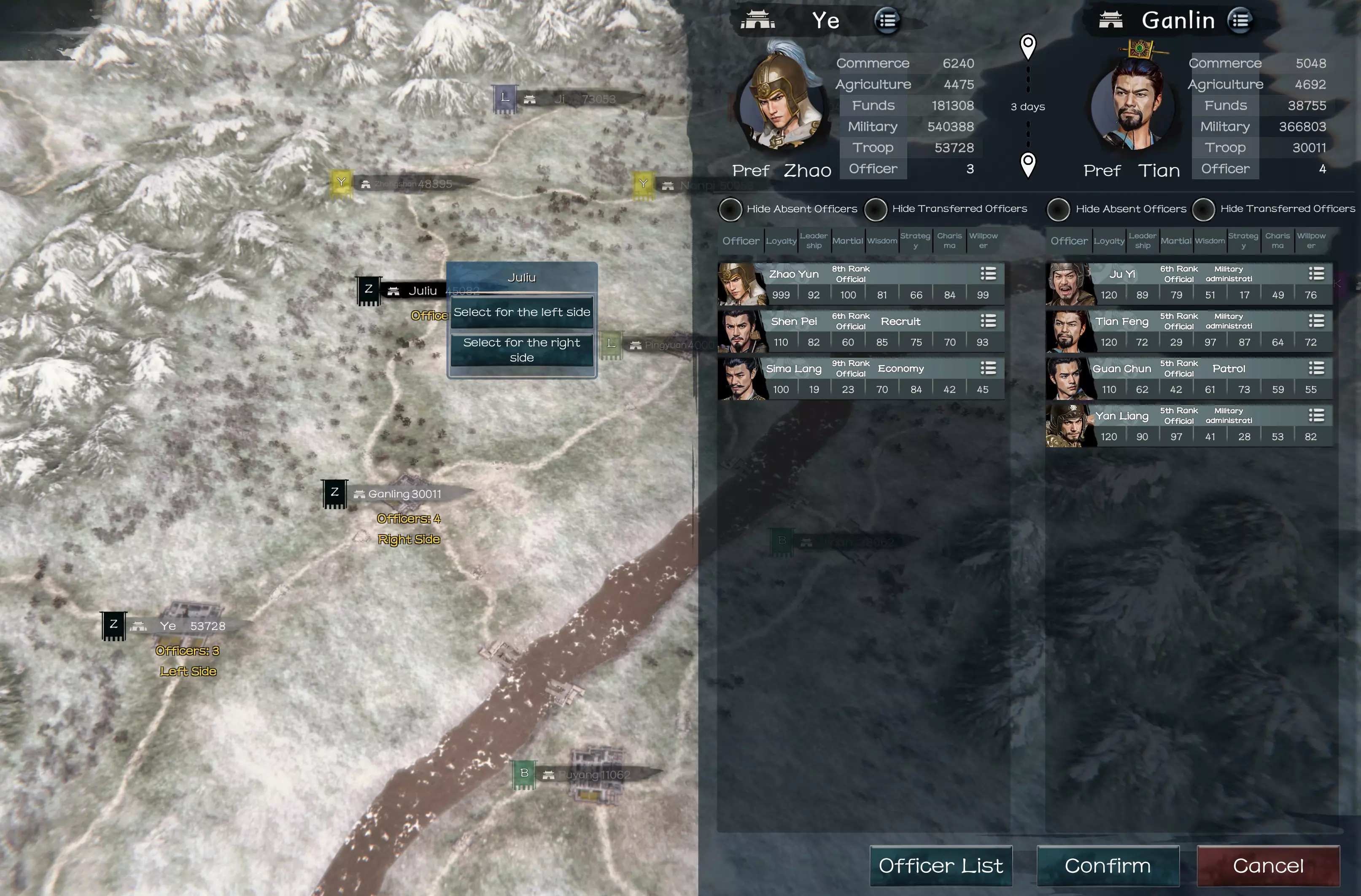 这意味着屏幕右侧的面板。当您拥有两个以上领地时,屏幕上会显示左侧面板和右侧面板。这是在进行如官员调动等操作时切换城市的方式。 设置