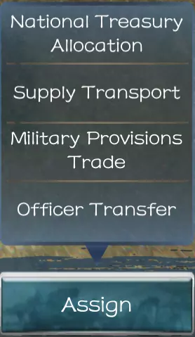 国库: 捐献私人资产指将个人金币捐赠给国库。 挪用指从国库中获取金币到个人资产。 补给运输: 将军事单位从一个城市调派至另一个城市。 军粮贸易: 进行粮食的买卖。 官员调动: 将官员单位从一个城市调派至另一个城市。 人事