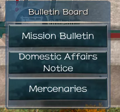 任务公告:在这里你可以选择任务,以获得特定官员的好感度,该官员通常驻扎在你当前拥有或未拥有的城市中。完成任务后,你可以通过所选官员获得大量奖励,包括金币、物品、好感度、关系值、声望、正面或负面的世界影响力以及总体功绩等。 内政通知:在这里你可以向你拥有或未拥有的特定城市中的官员分配任务。请注意,有些任务可能需要数月才能完成,而像征收税收这类任务,有时会因腐败问题而事与愿违。任务完成后,你将提升与该官员的关系值。 雇佣兵:在这里你可以雇佣随从跟随你在世界地图上行动。雇佣兵也可以驻守你的庄园,安置在私人或公共建筑中以获得额外收益。注意前期的招募成本和每月费用。 外交事务