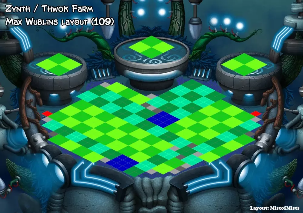 为合成赞斯,需要以下蛋: 1x 康果(寒冷、空气、绿洲) 1x 特洛克斯(植物、空气) 1x 橡树章鱼(植物、寒冷、水、心灵、舒格布什) 1x 潘果(寒冷、空气、大地、绿洲) 1x 鼓普乐(植物、空气、大地、精灵) 1x 莫(植物、寒冷、空气、绿洲) 合成赞斯的一些技巧: 只有在大多数怪物(尤其是康果)完成繁殖并准备好进行 zap 后,才开始赞斯计时器。 开始赞斯农场前,至少解锁植物岛、寒冷岛和空气岛。 对于康果和特洛克斯,如果拥有稀有品种,用稀有品种进行繁殖可获得 100% 成功率;否则,使用四元素怪物进行繁殖。 赞斯农场岛布局 最有效的赞斯农场布局如下,可在岛上容纳最多数量的巫布林(109 个):