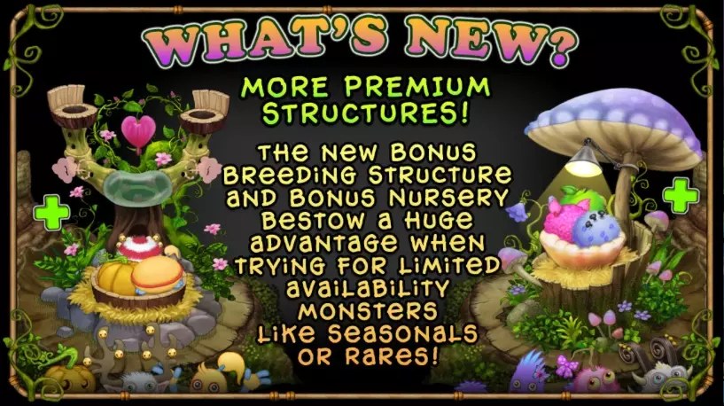繁殖组合 若想查询任意怪兽的繁殖组合或其他信息,请在《我的歌唱怪兽》维基上搜索。 许愿火炬 许愿火炬可以用2颗钻石点燃24小时,或用100颗钻石永久点燃(促销时价格更低)。也可以在好友的帮助下免费点燃。 游戏内未明确说明繁殖概率,但经过测试得知,每个许愿火炬可提供约1%的概率加成,因此点燃全部10个火炬可获得+10%的概率加成。 对于繁殖概率极低的怪兽,此加成至关重要,许多玩家都低估了火炬在完成怪兽收集过程中的重要性。如果你在培育珍贵怪物时遇到困难,可以使用火把。 怪物等级:在培育帮助菜单中会显示怪物等级,提升等级有助于提高培育出特殊怪物的几率。目前尚不清楚该加成的具体机制,但在培育前将父母提升到一个合理(且不会花费过高)的等级并无坏处。 培育时间:不同怪物的培育时间各不相同,因此在培育失败时选择培育时间最短的组合,能增加在一定时间内的培育尝试次数。例如,可用恩特 Brat 和 Bowgart 培育 Ghazt,但恩特 Brat 和 T-Rox 是更好的培育组合,因为 T-Rox 的培育时间更短(8小时,而 Bowgart 为12小时)。所有怪物的孵化时间可在《我的歌唱怪兽》维基上查询。 金币产出 除了烘焙外,以下是一些有助于提升金币产出的额外技巧。 使用四元素怪物。最适合金币 farming 的怪物很大程度上取决于你收集金币的频率,不过四元素怪物是个不错的起点,它们拥有较高的金币上限和产出率,并且与其他高金币产出怪物(如以太怪和 werdos)相比,获取难度相对较低。 在你能快速赚够钱之前,不要购买 Wubbox。许多新玩家会选择存钱并在 20 - 25 级左右尽早购买 Wubbox。Wubbox 的金币产出较低,需要相当长的时间才能回本。除非你愿意因此减缓游戏进度,否则不要过早购买。 游戏内提供使用真实货币的购买选项。 虽然用真实货币购买游戏内货币有诸多好处,但本节将帮助你找到最具性价比的消费方式。 强烈建议至少购买游戏内的一项物品,因为这会解锁高级建筑并移除“全部收集”按钮的使用限制。由于购买金额无关紧要,你可以选择最便宜的货币选项来获取所有高级权益。 虽然高级建筑、终极矿场和“全部收集”按钮并非游戏进度的必需品,但它们能显著帮助你快速获取新怪物并轻松收集金币。