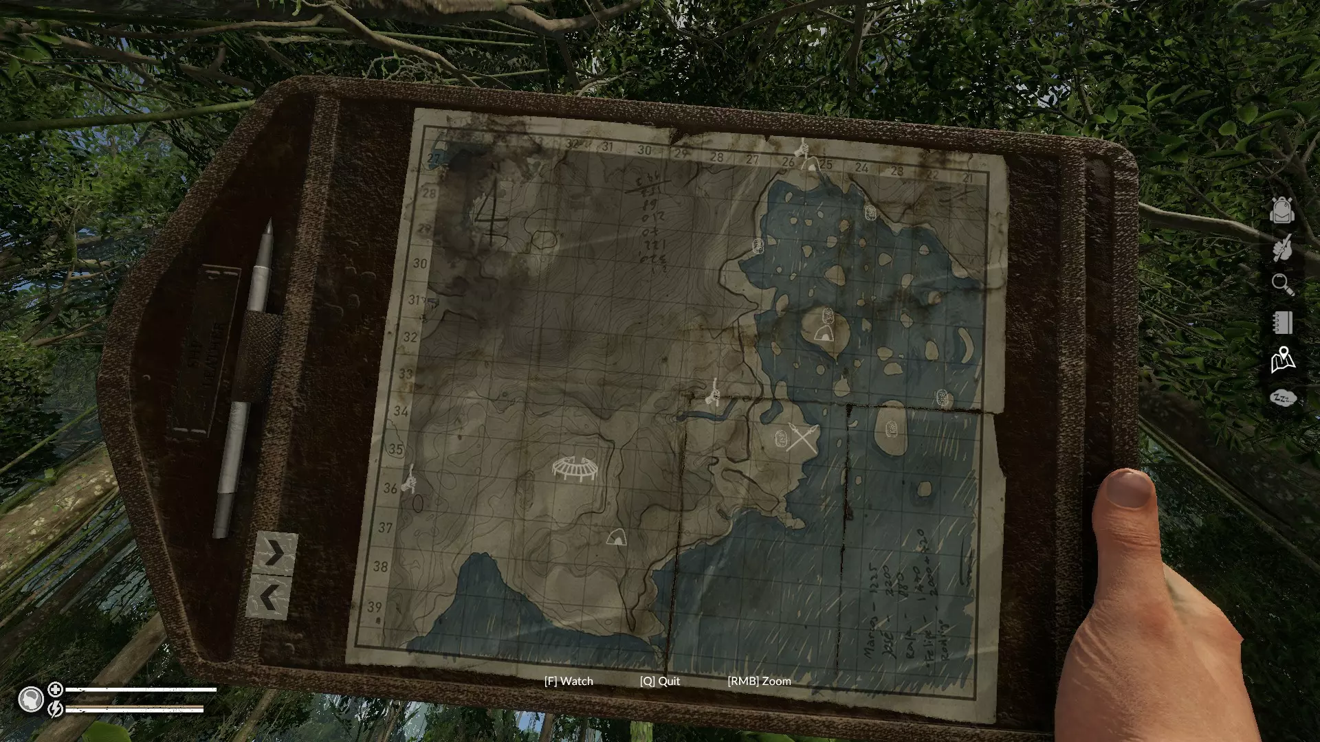 Alternative Curatives Unlisted method of curing diseases, but generally list all of the methods to cure it Bleeding WoundDrains health slowly, and will become infected if not bandaged soon enough Leaf Bandage of any sort would close it, other upgraded bandage will do too Banana DressingLaceration WoundDrains health really fast, Will become infected after a short time Leaf Bandage/Banana Dressing (small chance of leaving infection instead) Ash Dressing Honey Dressing Jungle Ants: Placed on the woundInfected WoundWill reduce sanity, and cause fever if left too long. Gained from not treating wounds. Maggots: Placed on the wound (do not eat) Honey Dressing Goliath DressingSnake/Scorpion VenomWill drain your health until the venom is removed, failiure to do so is guranteed to cause death. Gained when being stung/bitten by scorpion, spiders, and rattlesnakes Tobbaco Leaves: Bandaged & Stewed (Bandage removes the venom and the wound over time, while stew removes only the venom, not the wound) Plantain Lily (Heart leafed herb): Eaten, Bandaged, & Stewed PainkillerDart Frog VenomYou'll likely get it from accidental touching. Much more dangerous than snake venom, but uses the same method to heal. On top of bandaging, I recommend drinking the antidote stews in order to fully recover from the poison. WormsConstantly drains sanity until removed, will leave a bandageable wound that can get infected after removing the worm. Gained when sleeping on the ground, or non-elevated leaf bed. Needles (Bone Needle) (There are fish bone and stingray tail but I haven't tested it) Sleep in elevated log/bamboo bed or hammocks to avoid thisFeverWill drain your fatigue rapidly, and makes every action harder to do as long as you have fever. Gained when being envenomed and when sleeping without shelter Quasi Amara: Stewed Bone Infusion A good rest at on good bedRashTemporarily reduce your sanity and prevent regeneration as long as it is presist, ignorable and will heal by itself quickly Honey Dressing Lily Dressing TimeFood PoisoningWill make you vomit whenever any of your nutrition and hydration is filled more than its half. Gained from eating the wrong food Charcoal: Eaten Water Lily Flower: Eaten, better if stewed Bone Infusion PainkillerParasitesParasites will increase your nutrition uses and can lead to death by starvation. Ignorable at small number but will not go away until it gets cured. Obtained more commonly from eating raw meat and drinking water from natural sources Cup mushroom: Eaten, better if stewed Blue mushroom: Eaten Soursoup: Eaten, but better if stewedInsomniaMakes sleeping harder and cure less stamina, becomes problematic at high number. Gained when you don't sleep for more than two day straight Sleep, just sleep for awhile my dude Amazon Delivery Catalog For rare missable Items & Unlockable craftables Specific Item Obsidian: Found of any cavern, highest tool damage, best used to make weapons. Ash & Charcoal: Obtained from burnt off campfires Honey: You get that by breaking wasp nest from a distance, adds good amount of sanity Brazillian Nut Shell: Main component for fishing rod, the nutshell are found from brazillian nuts dropped by that large tree that sometimes have blue mushroom growing on it Bidon (Modern Canteen): Can be found by following a dirt road with tire marks, one way leads to a runoff jeep with the bidon near the crash, another way leads to jaguar nest. 100 water capacity Machette: Hadn't found one myself, but it exists in the game tutorial zone Rusty Machette: In some sort of abandoned drug den next to a grill Metal Pot: Also in said drug den Wooden Spoon: Usually found alongisde the metal pot, completely useless to carry around Painkiller: Found on a rundown jeep and the drug den, cure most aliments but is extremely rare Bone Knife: Recipe found when picking bone knife found in drug den/uninhabited tribal camp Tribal Firestarter: Recipe unlocked when picking tribal firestarter found in any tribal camp Tribal Bow: You still can loot this off a tribal archer, this weapon is inaccurate at low bow skill Tribal Spear: Same as above but from tribal spearman Tribal Arrow: Found in chests, may be used by tribal archers Metal Cans: 4 are found at the fishing wharf, can be smelt like an iron oreFurniture CatalogThis list all of the unlockable item that you can build; Refer to another section for details on location and coordinate. Increasing your crafting skill would also unlock new furniture without needing to find them. Stone Trap: Small and easy to make traps (Catches: Mouse, Frogs, & Lizards) Snare Trap: Found around the jungle as one of the native's traps (Catches: Nothing) Cage Trap: Found behind the abandoned village, by the banana tree farm (Catches: Mouse, Frogs, & Spiders) Killer Trap: Found within the drug then, by one of the cocaine plots Fish Trap: Found on the fishing dock, large trap catch two fish at a time, while smaller one catches one (Catches: All fish) Prawn Trap: Found on a small encampment in the middle of the oasis (Catches: Prawns) Spike Trap: Unlocked automatically at a certain crafting skill level Bow Trap: Same as spike trap (Catches: People) Log Bed/Bamboo Log Bed: Found on a cave behind a plane crash Hammocks: Found on any tibal huts, not craftable yet Grill Rack: Found in the center of an abandoned drug den Moisture Collector: In the back of the drug den Campfire & Stone Rings: Found on any tribal huts, or most places in the game Smoker: Found on a hostile tribal camp or bamboo camp Drying rack: Found on the uninhabited tribal camp, not that far from the safe valley Water Filter: On a small fishing hut next to the large river Medium Bamboo Hut: Found on bamboo camp behind the river delta Weapon Rack: On a hostile tribal camp Mud Forge: Unlocked as soon as you picked a mud from a river Charcoal Oven: Same as the forgeA thread by steam user @oi__io provides exact location for unlockable items: https://steamcommunity.com/app/815370/discussions/0/17354636200816816
