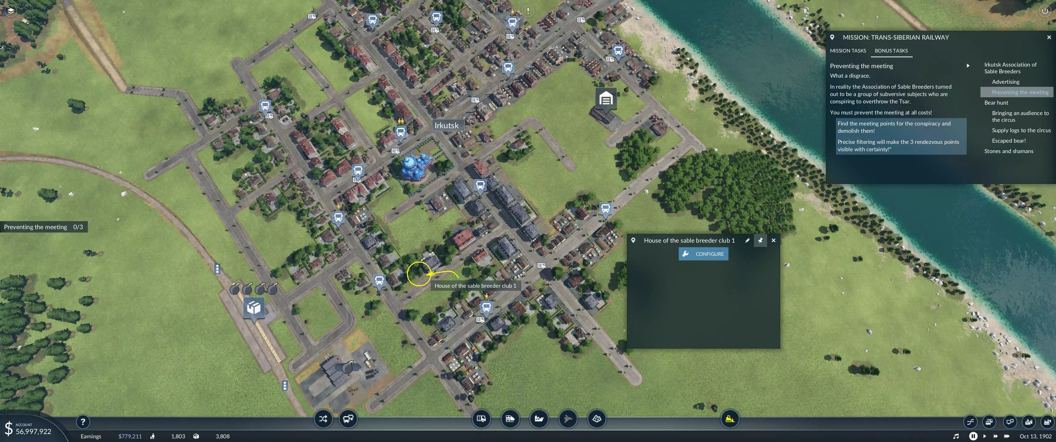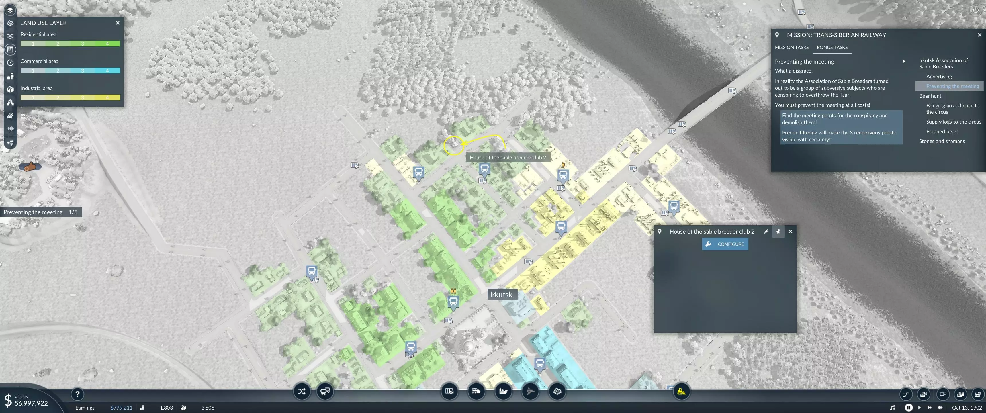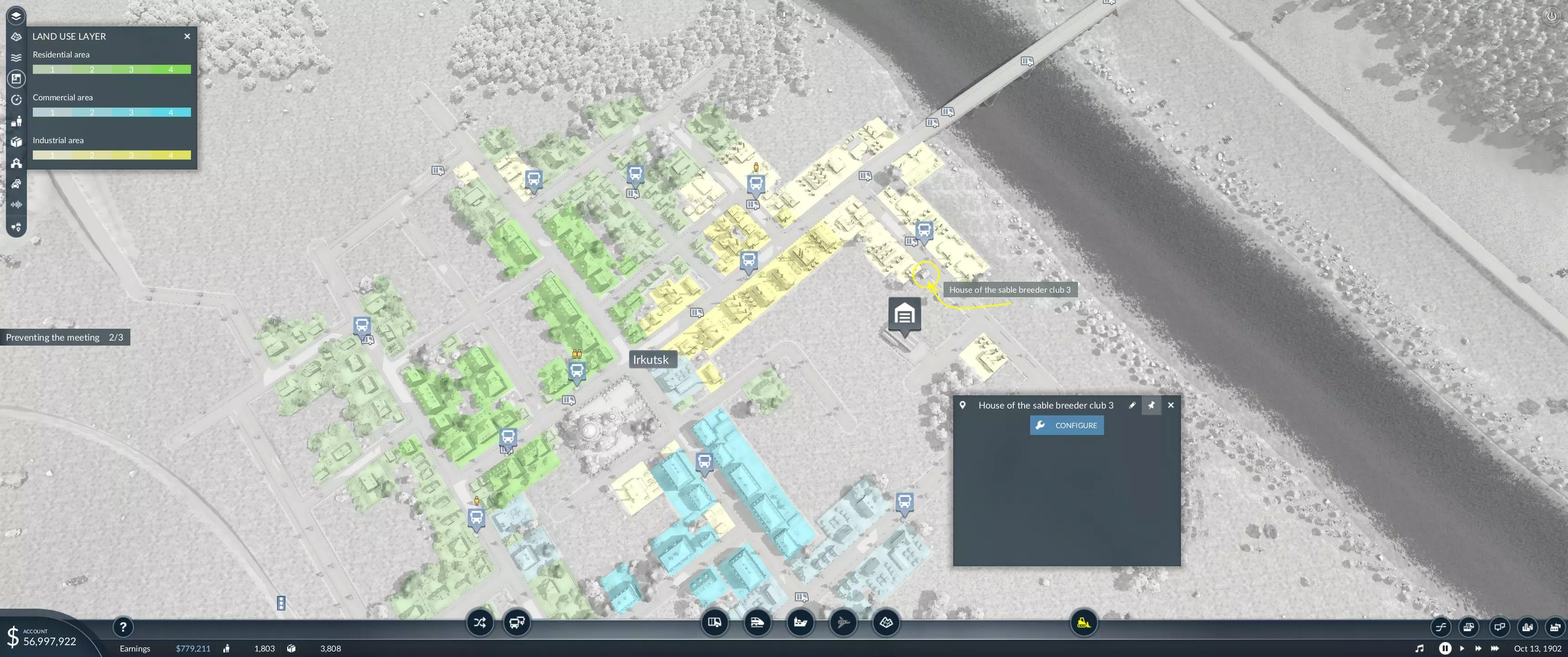 大家好,感谢您阅读这份简短指南,它将帮助您完成第一章第五关“阻止会面”的额外目标。这份指南的存在是因为起初,和许多人一样,我很难理解会面地点的具体信息、位置以及寻找方法。我查阅了多年来的各种讨论帖,但仍然希望信息能更清晰一些。 就像生活中的其他事情一样,一旦掌握了窍门,就不再困难了,对吧? 剧透警告 虽然可能没必要,但还是要提醒——如果不想知道这里揭示的内容,请现在离开,哈哈。黑貂饲养者俱乐部之家 首先,使用游戏屏幕左上角的土地使用过滤器,此时所有内容将变为绿色、蓝色、黄色或灰色阴影。 绿色=住宅建筑 蓝色=商业建筑 黄色=工业建筑 灰色=其他所有建筑 其次,只有伊尔库茨克市是重点关注区域。三个地点都能在这里找到,不过我不记得游戏内的叙事有提到过这一点。 第三,难以找到的黑貂饲养者俱乐部之家与其他典型建筑外观完全不同。它是一座小型的破旧房屋,坐落在更多正规建筑之间,部分被树木遮挡。将光标悬停在该建筑上时,会显示“House of the Sable Breeder (1、2或3)”。当你最终找到它时,关闭过滤器,使用拆除/破坏图标,此时会要求确认,在确保无误后,确认并删除它。以下是伊尔库茨克市的位置截图。