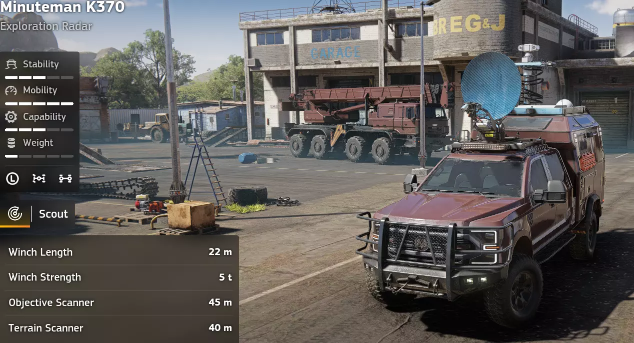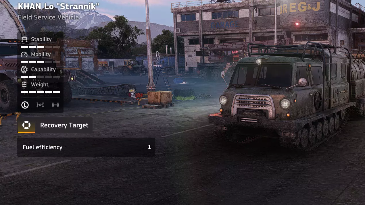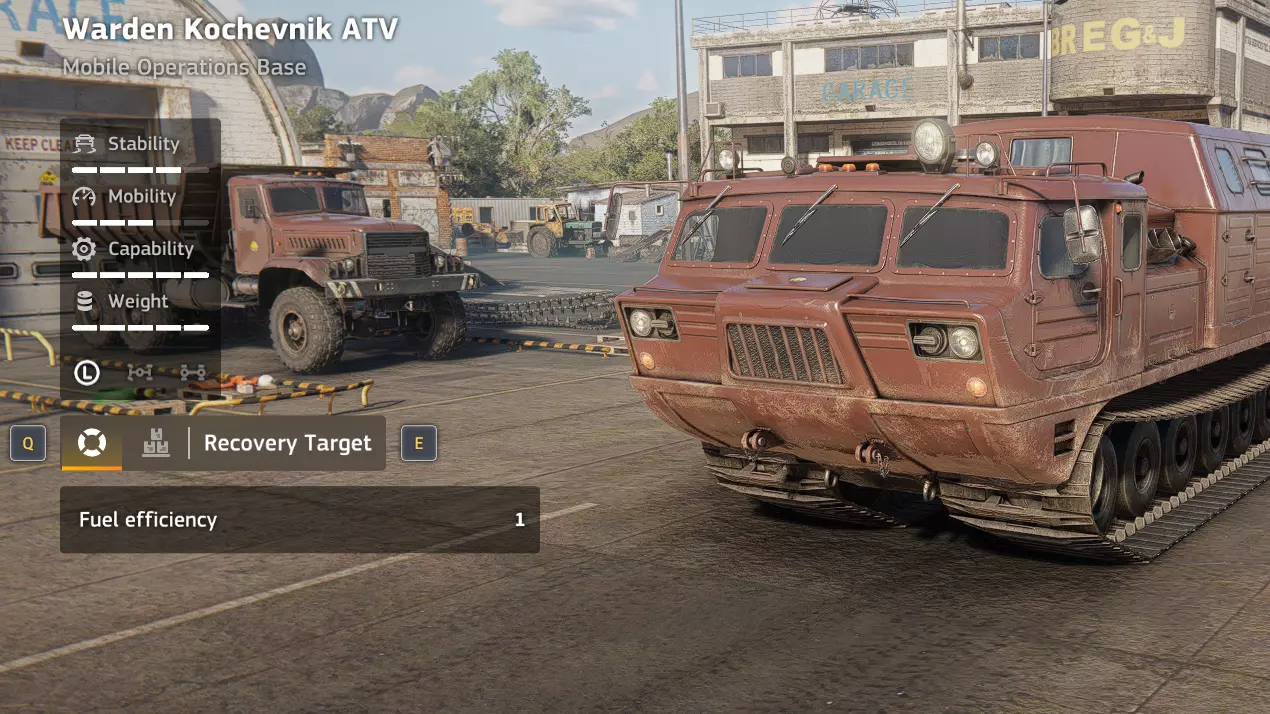 价格:免费!解锁条件:余波 说明:免费的野外救援车辆。极大地提升便利性并节省时间,将这辆双节救援车部署在设施处,即可传送你的起重机/空载货运车辆至该处。也非常适合救援和拖曳你的其他车辆。 优点:我提过它是免费的吗? 出色的越野能力 极大提升游戏体验 用途广泛 履带式 缺点:速度较慢 部署可能不便 特殊装备(“Krot” Vostok TK-53)