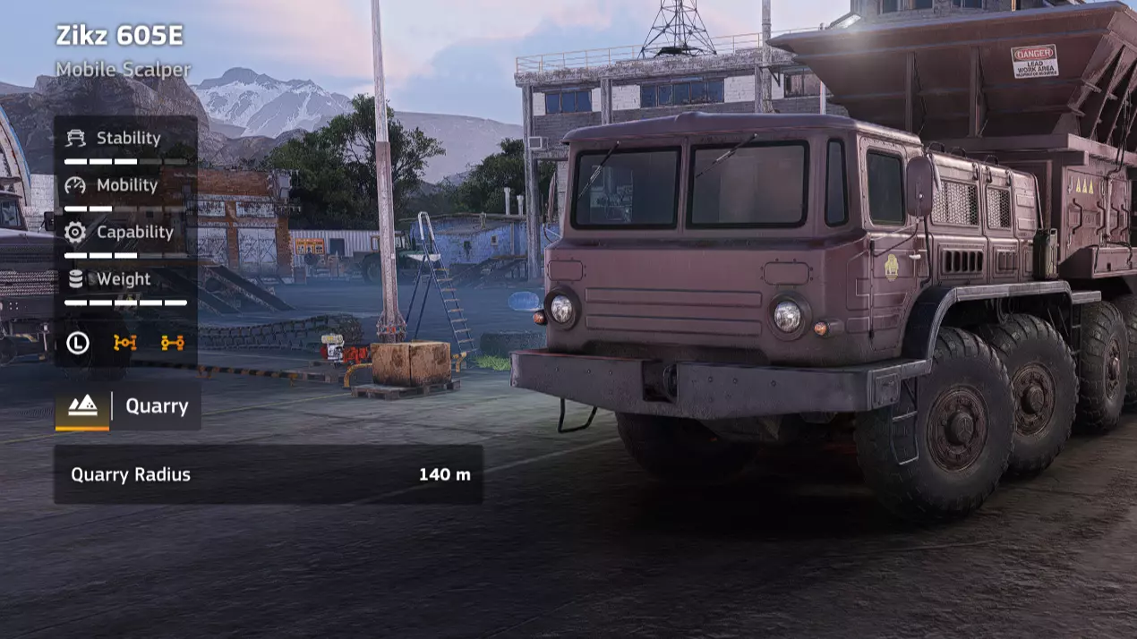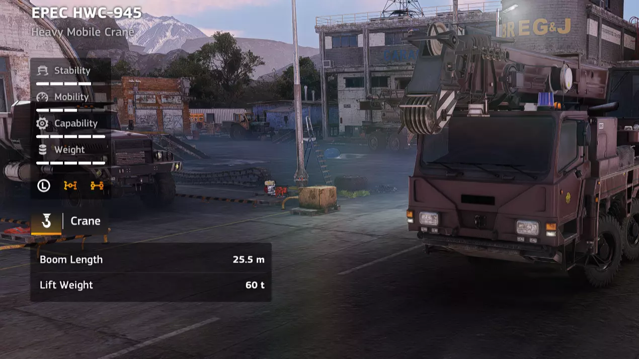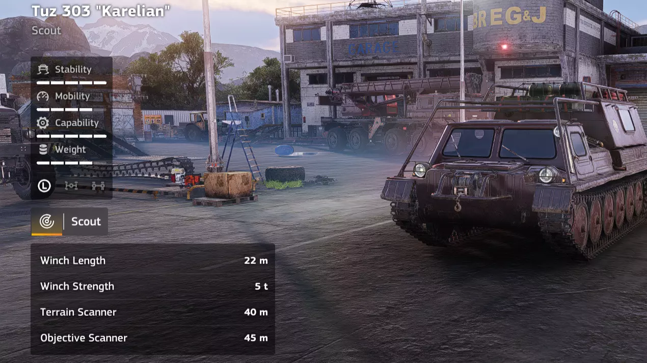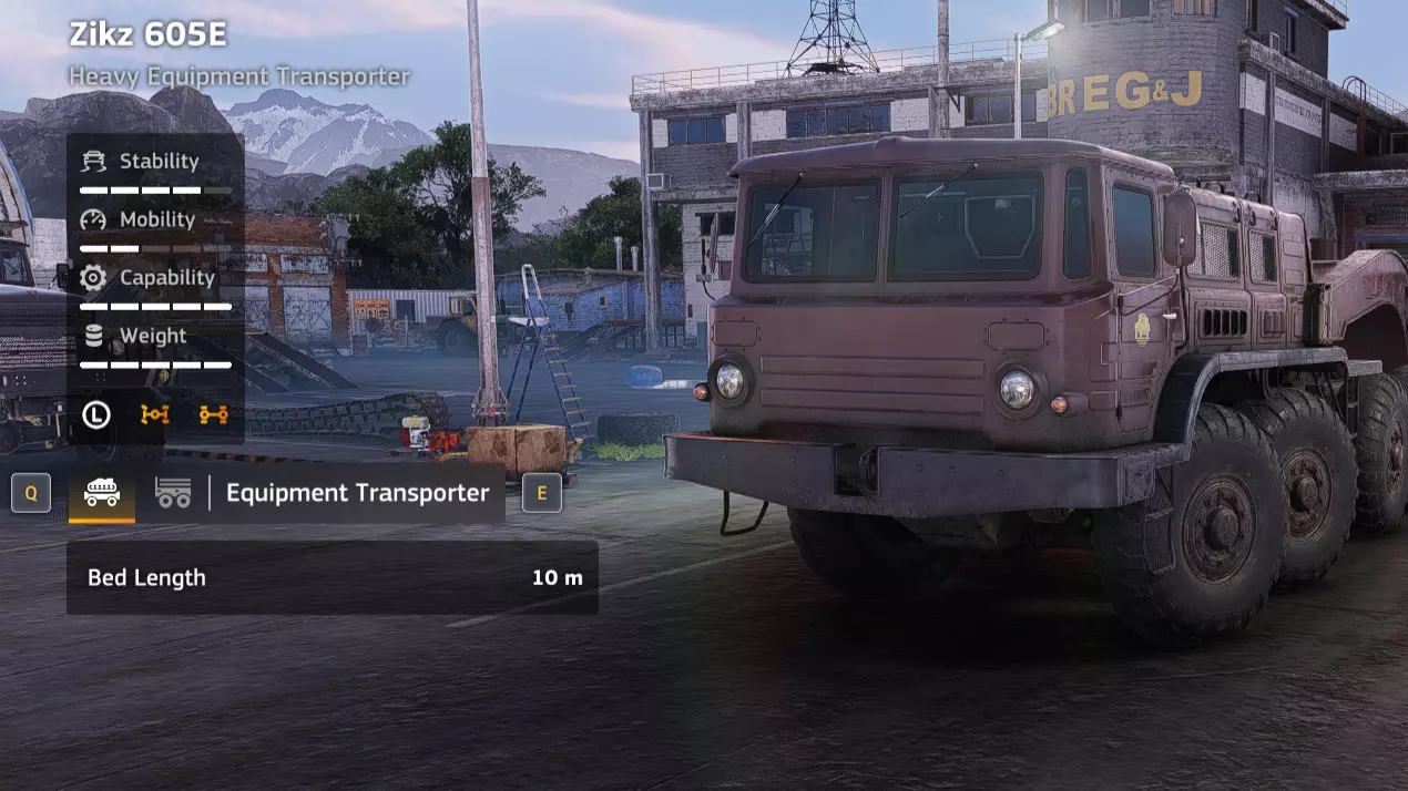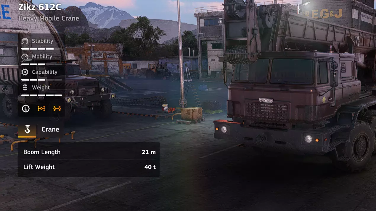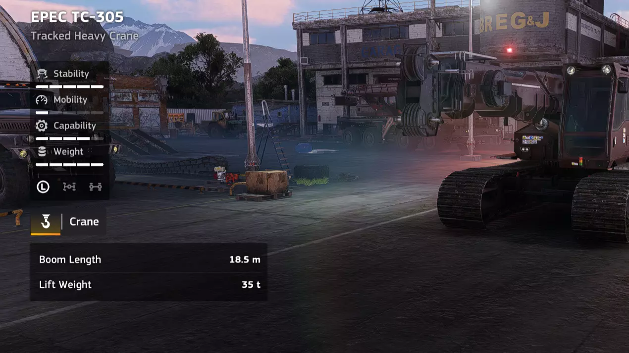 价格:58,000 解锁条件:公司等级16 说明:相比之前的轮式起重机有了很大提升,但它仍然是一款性能出色的车辆。我在贝加尔(Baikal)笔记中提到的所有优点在这里同样适用。不过,这款车辆特别适合在设施区域使用,因为它没有锚点,可以连接并移动重型废弃物。它的越野性能也很出色,如果需要在基础设施较少的区域回收某种重型货物,它可能会成为你的首选。但优点到此为止,这款车非常重,而且速度很慢。你会发现你的兹克Zikz 605E在拖运它时会开始吃力,而由于上述的速度问题,你不得不经常拖运它。此外,就其价格而言,它的吊臂长度和强度并不出众。Zikz 612C拥有更好的起重机,同时价格便宜一万四千 credits。它并非必选车辆,但加入你日益增长的起重机收藏也无妨。 优点: - 无锚点 - 起重臂性能出色 - 越野性能良好 - 履带式 - 用途广泛 缺点: - 价格昂贵 - 起重臂性能不如更便宜的替代车型 - 解锁较晚 - 起重机(EPEC TC-305抓斗)