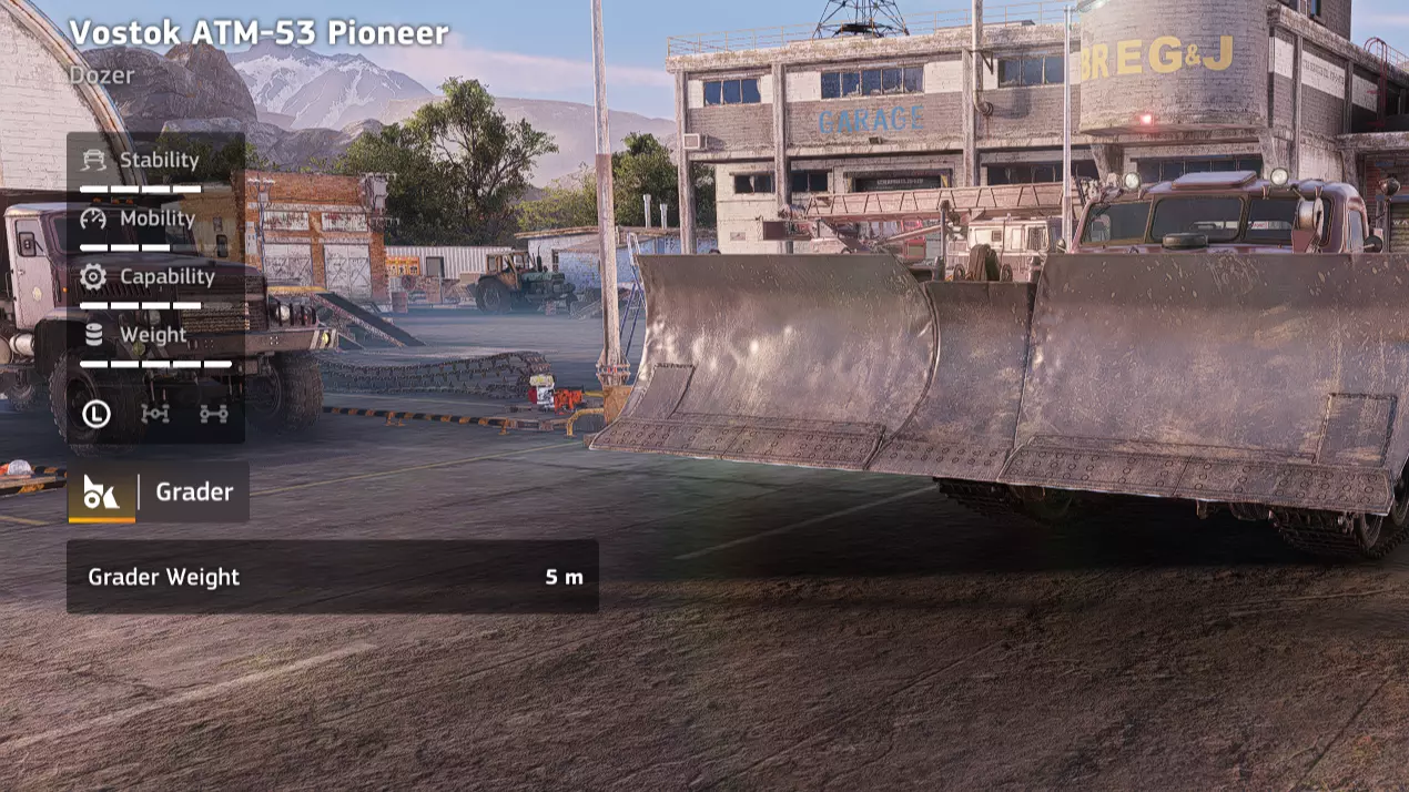 价格:62,000 解锁条件:公司等级14 备注:相比另一辆平庸载具,这只是一个令人失望的升级。从“地堡”换为“阿林”后,我最不喜欢的是其更大的尺寸。这意味着它无法舒适地放置在“派克”的车斗上,而将其与另一辆载具一同放在“兹克兹”的车斗上则空间非常局促。 优点:最佳摊铺宽度;比“地堡”更容易操控 缺点:价格昂贵;仍是沥青摊铺机;道路工程(Vostok ATM-53 Pioneer)