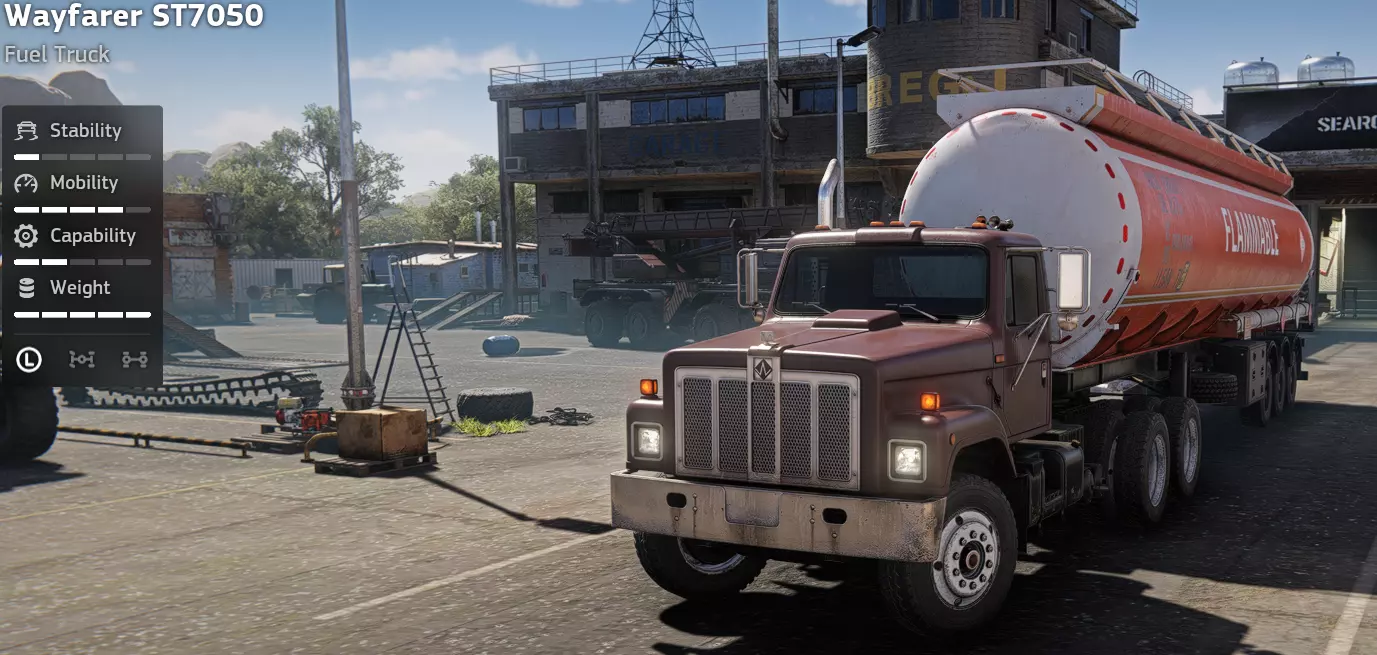 价格:35,000 解锁条件:公司等级5级 备注:这是一款颇具争议的载具。在我看来,如果你已经拥有性能更优的Zikz 605E,那么这款载具就显得相当多余。我能想到的仅有的两个优势是:封闭式货箱便于装载货物,以及在铺装路面上的机动性略好一些。 优点: - 超大载货空间 - 机动性尚可 缺点: - 车身较长,货箱巨大且不可拆卸 - 越野性能极差 - 发动机动力严重不足 - 性价比不高 特殊设备(Wayfarer ST7050燃油卡车)