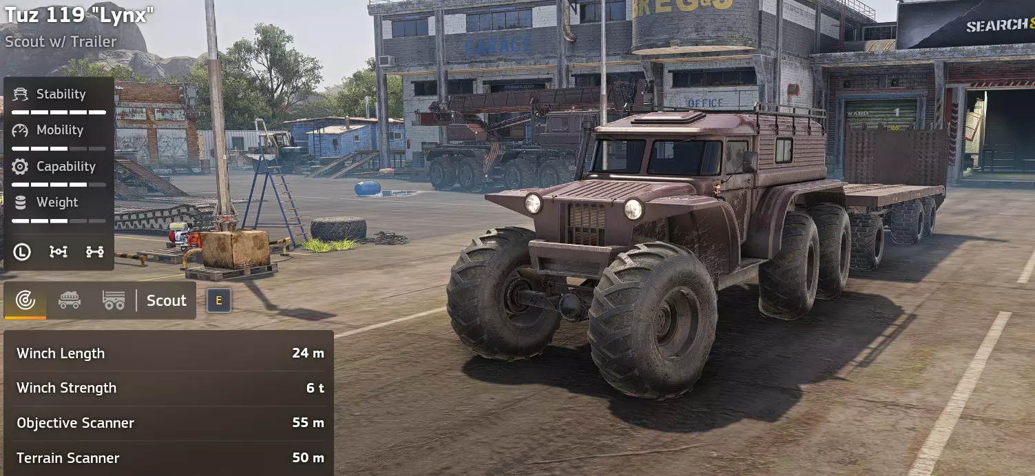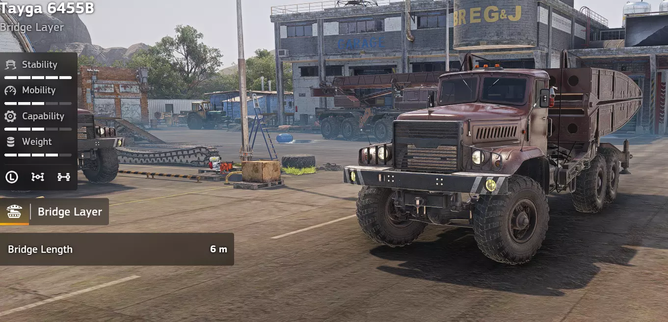 价格:120,000 解锁条件:公司等级20级 说明:此物会改变你的游戏玩法,考虑到它解锁得很晚,这也合情合理。资源存储功能潜力巨大,具体如何使用取决于你,但可以肯定的是,它能极大提升游戏体验。它保留了KHAN的重生功能,便利性再上一层楼。不过令人非常失望的是,它取消了KHAN的绞盘。购买并使用它吧。 优点: - 极强的越野能力 - 独特的资源存储功能 - 极大提升游戏体验 - 速度快 缺点: - 转向缓慢 - 价格昂贵 - 最后解锁 - 无绞盘 - 车身很长 特殊装备(Tayga 6455B【桥梁铺设器】)