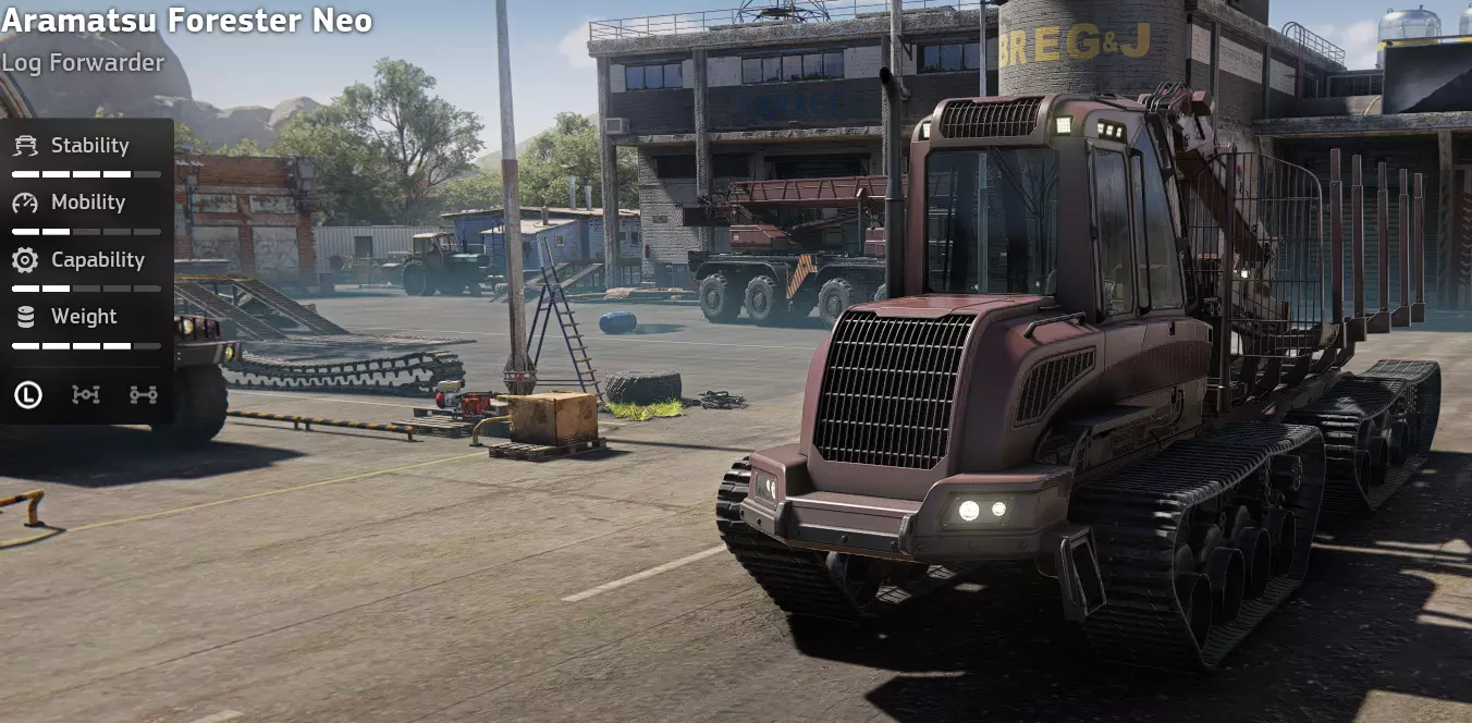 价格:44,000 解锁条件:公司等级11 说明:又一款专用装载机,基本是无关紧要的载具。虽然可能比MTK装载机好一些,但价格昂贵,而且可能仍然不如任何专用起重机。除非你钱多得没处花,否则建议避免购买。 优点:平台性能良好 缺点:价格昂贵 所有集材机均可配备原木装载机 可能不稳定 伐木(Aramatsu Forester Neo)