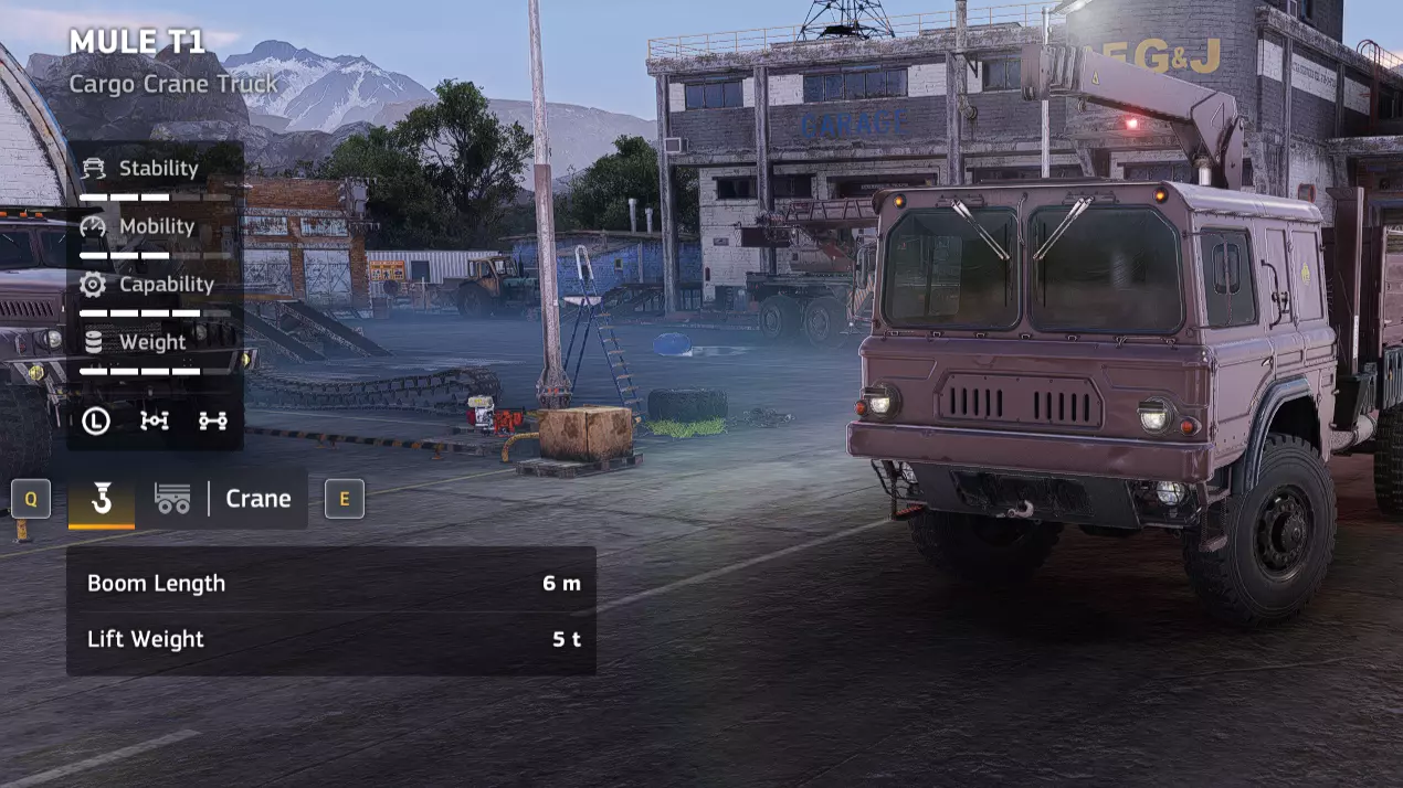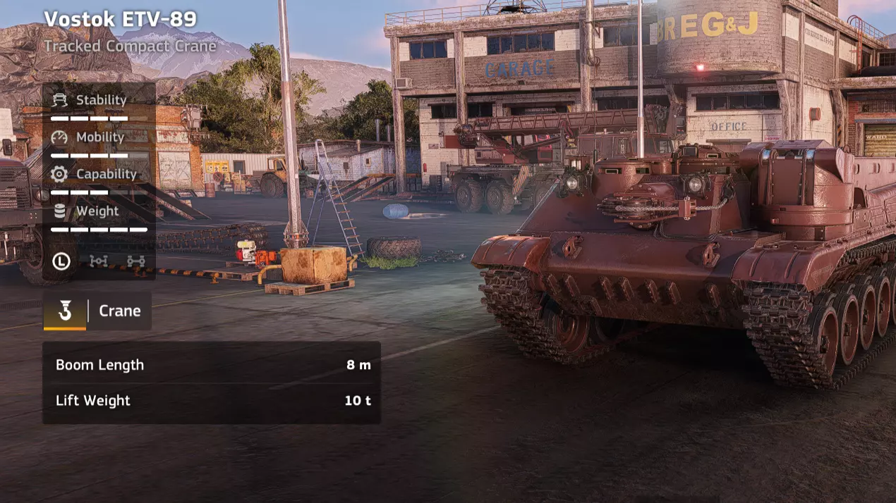 价格:46,000 解锁条件:公司等级12 说明:这是大型起重机中的特例。虽然这款车辆与其他起重机有很大不同,但它仍有其用途。与EPEC履带式重型起重机类似,它非常适合清理设施区域的垃圾。它也是一个相当不错的平台,不要被5吨的低承载能力所迷惑,它的实际能力远不止于此。不过,LT 200本质上是升级版的Mule T1起重机,却要多花费19,000 credits。是的,它能承载更多货物,越野性能也更好。但如果你资金紧张,真的没有必要花这笔钱,还有很多更好的选择。优点: - 越野性能良好,即使负载时也表现出色 - 配备起重机和货箱 - 用途广泛 - 采用履带设计 缺点: - 行驶速度慢 - 抓斗操作有难度 - 难以抓取大型货物 - 性价比不高 - 离地间隙小 - 起重机【Vostok ETV-89】