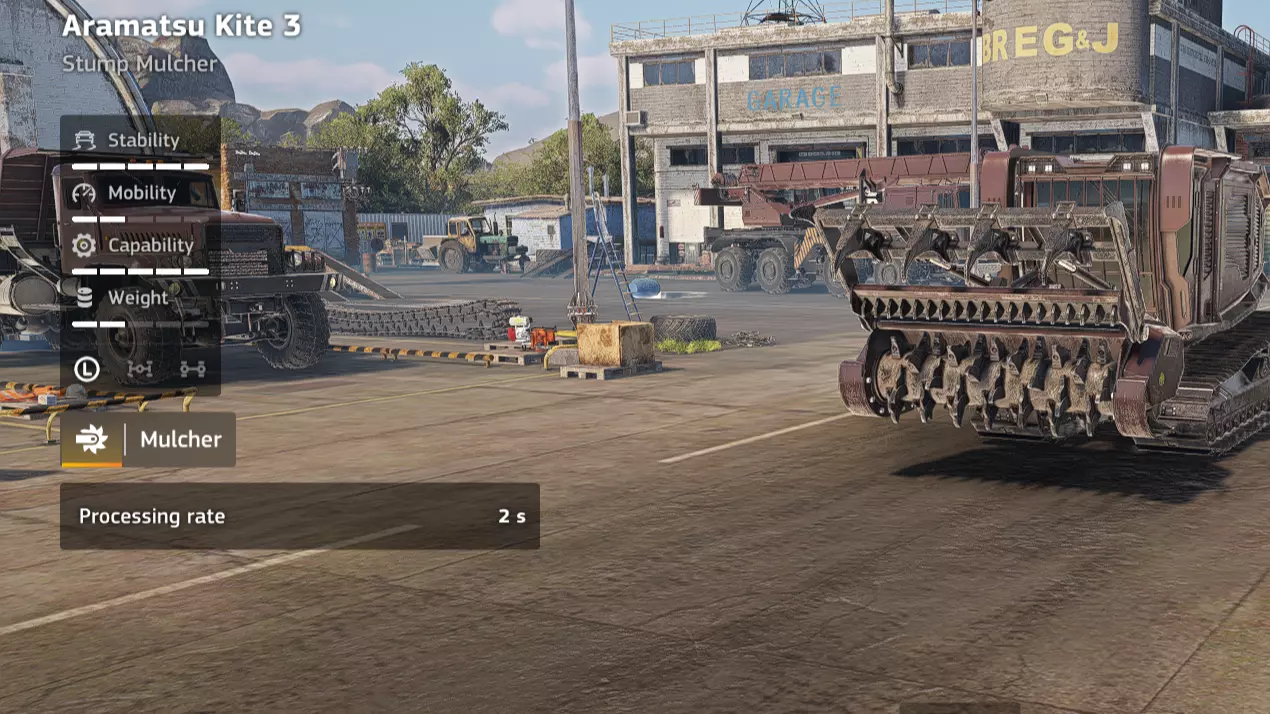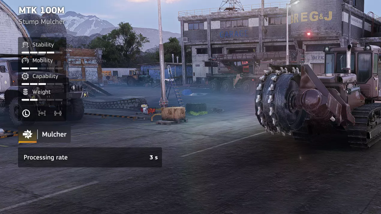 价格:41,000 解锁条件:公司等级13 备注:这是一辆非常出色的载具。即便不进行伐木作业,它快速清理区域内直立树木和树桩的实用性也非常好。如果只能从伐木类别中购买一辆载具,那就是它了。 优点: - 履带式设计 - 宽刀片可同时击中多个树桩 - 非常适合清理穿过林区的路线 - 越野能力相当不错 缺点: - 价格较高 - 速度较慢,但不及MTK 100M慢 - 用途较专一 - 用于伐木(MTK Proseka 200 集材机)