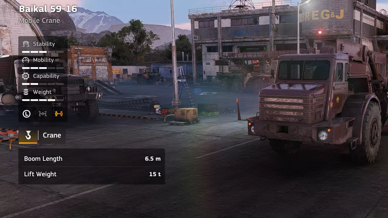 价格:23,000 解锁条件:悬崖 说明:贝加尔可以作为一个引子,来说明本游戏中的所有起重机都很出色。起重机类型用途广泛,是装载货物的最佳选择,同时还承担着“救援车辆”的职责。另外值得一提的是,拥有多台起重机是非常便利的设置,这样你可以在每个设施/基地都放置一台起重机,专门用作装载工具。考虑到这些因素,贝加尔可能是最差的起重机。如果不仔细定位,较短的吊臂长度会让装载货物变得相当麻烦。 优点:速度快、机动性好、用途广泛、价格便宜 缺点:吊臂长度短、转向慢 起重机(Zikz 612C)