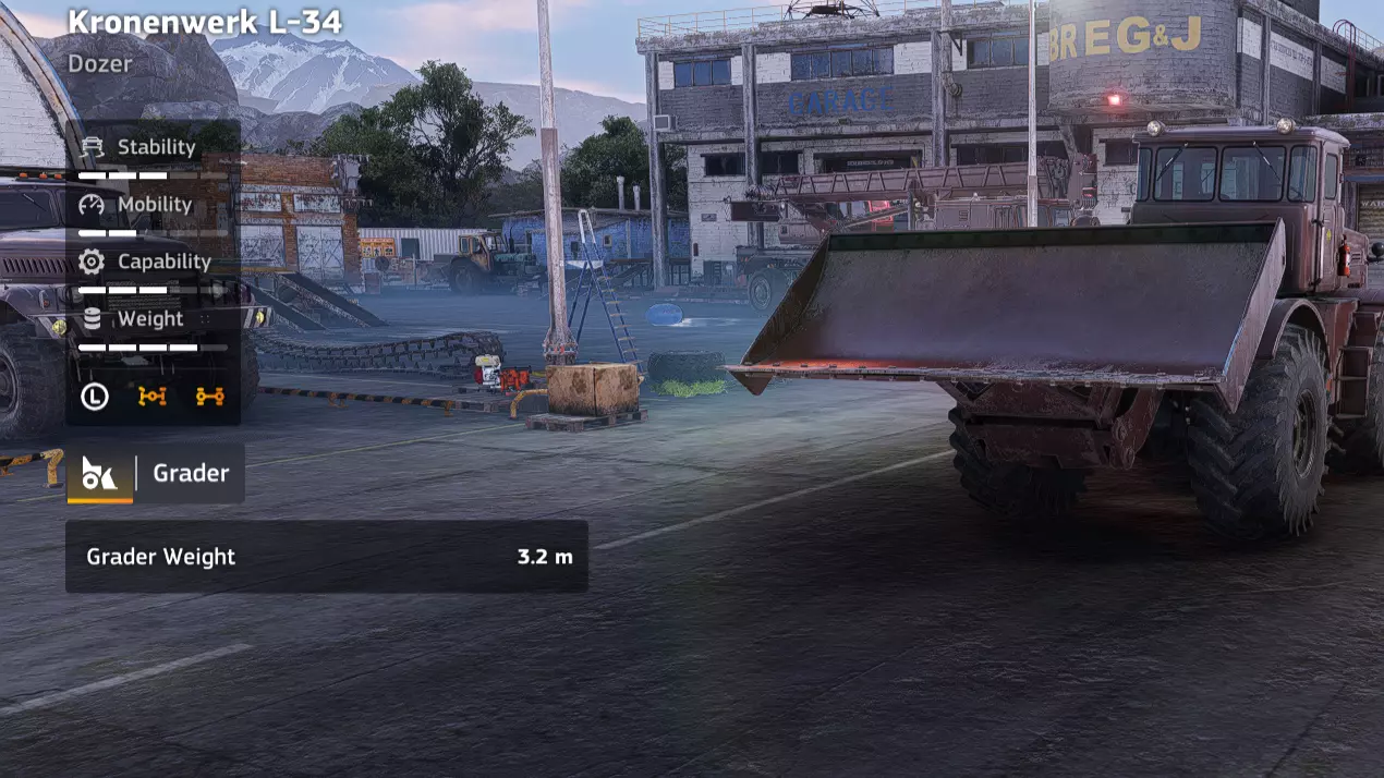 价格:20,000 解锁条件:余波之后 备注:早期游戏中非常值得获取,值得注意的是它比其生锈版本有相当大的性能提升。可能是你在起重机/货运卡车之后的第二个购买选择。 优点: - 最快的自卸车 - 即使满载,越野能力也相当不错 - 在游戏早期到中期都保持实用性 缺点: - 获得鲸鱼头之后变得有些无关紧要 - 容量第二低的自卸车(10吨) - 很难均匀倾倒沙子 道路工程(Kronenwerk L-34 推土机)