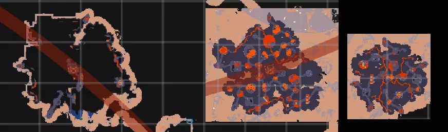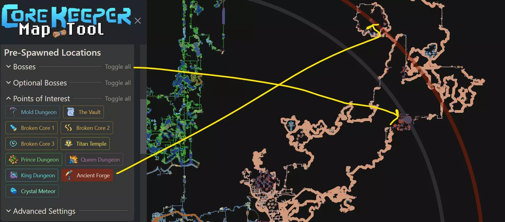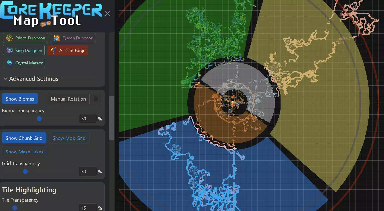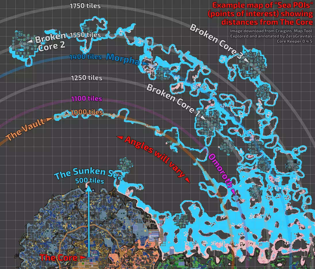 曲线探索 正如我之前所解释的,大多数特殊事物或事件都能在距离核心一定距离的环形区域内找到。例如,首领或兴趣点。 需要记住的是,游戏会在你探索时动态生成首领位置和兴趣点,因此理论上,它们应该在你已经探索过的区域附近,只要它们与核心保持最小距离。 同时装备王冠和史莱姆王凝胶(King Slime)会使许多敌人不会攻击你,甚至包括非史莱姆类的生物,如螃蟹或火蝴蝶。 有一个对我探索地图非常有用的工具,叫做CK Map Tool。这是一个你可以上传地图的网站,该网站会在地图上为你提供一个戒指的位置,以便你寻找物品。