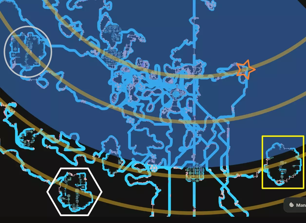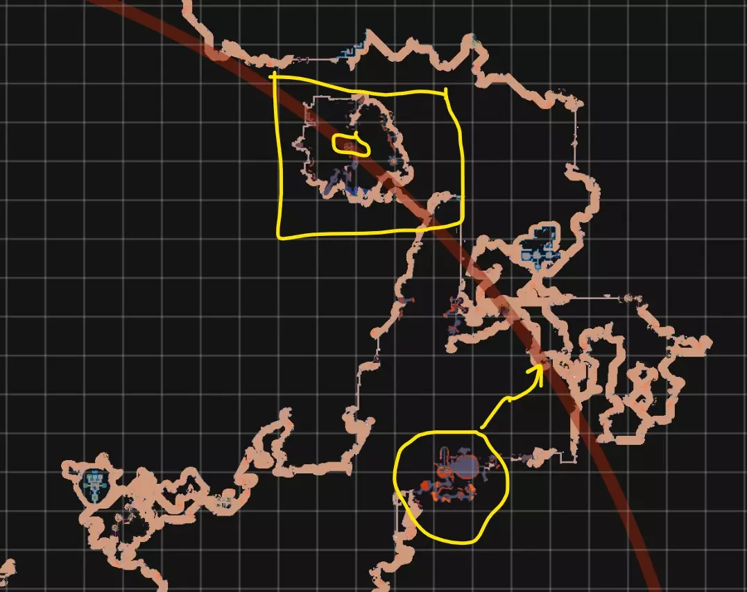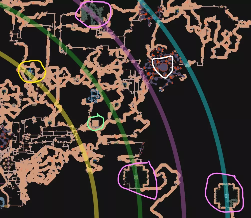 这张图片是我在CK地图工具中的地图,上面有4个圆环,用于定位完成任务弧所需的所有内容。如你所见,3个大都市的中心和宝库正好位于圆环的曲线上。