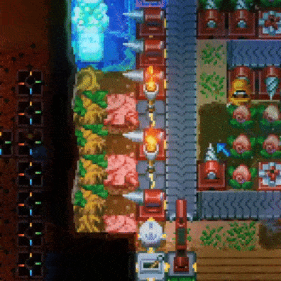 它可以用来从带有X标记的地方获取宝藏。 另一个功能是清除地面上的淤泥和苔藓。 你可以将这些东西从它们的原生位置带走,并安装在你将要创建的房间里,这样敌人就会在那里出现。 敌人会从带有淤泥或苔藓的方块中出现,附近的方块越多,敌人出现的概率就越大,但有一定限度。有其他指南会更详细地介绍这个概念,如果你喜欢以最高效的方式做事,可以去阅读一下。 许多敌人会互相攻击,这让共享动物园变得非常有趣。关于动物园内的陷阱和物品 当敌人被陷阱攻击时,它们会尝试攻击陷阱,因此炮塔不如地面陷阱(尖刺陷阱和火焰陷阱)或熔岩粘液有效,这些陷阱能持续灼烧敌人直至其死亡。 你可以将地面陷阱放置在苔藓/粘液上,当敌人出现在陷阱上时,陷阱就会触发。 炮塔对非远程攻击的敌人可能有用,此时使用围栏而非墙壁。 你制作和安装的陷阱不会对你造成伤害,只会对敌人造成伤害。 你可以使用传送带将敌人移动到特定地点。关于照明,由于敌人会远程攻击并破坏火炬,你可以使用在奥克托林工作台制作的发光魔法地板。
