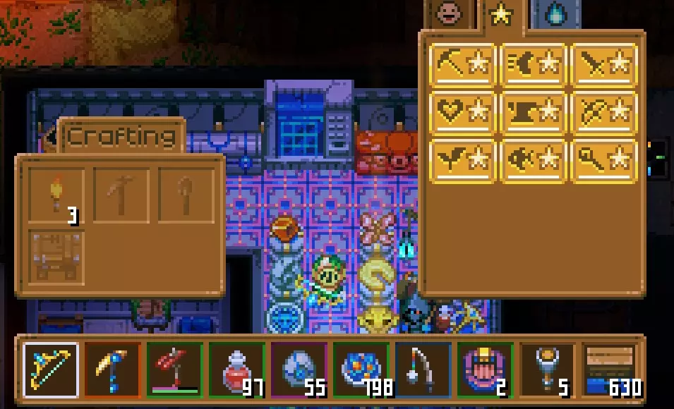 最近我玩了很多这类游戏,你进入一个世界,开始建立自己的基地,进行探索、建造、制作,寻找新的材料,与首领战斗,让自己变得更强,然后继续探索,如此循环,直到击败所有敌人、探索完所有地方。 像《泰拉瑞亚》《凯普莱特》《Necesse》《莫塔之子》《星界边境》这类游戏都采用了这种概念:从一个你可以自行建造的基地出发,探索新世界,同时你也可以专注于类似《牧场物语》《星露谷物语》那样的玩法,比如耕种或采矿。 还有更多3D类型的这类游戏,但我上面提到的这些是我觉得与8/16位2D艺术风格最相关的。这份指南适用于那些在游戏中不知道该如何继续,或者想要达成100%成就,又或者希望通过我的技巧和笔记让游戏体验更高效的玩家。 2023年8月:游戏终于被翻译成西班牙语了!可以尽情游玩了! 由于我是在游戏翻译完成之前制作的这份指南,所以有时会用英文来指代地点或物品,希望不会造成太大困扰。 指南中的许多信息来自我的游戏经验和维基百科。关于成就 不存在会错过的成就,如果你找不到某个物品或首领,随时可以创建一个新世界,并且保留你当前装备的所有物品。 如果你在经典世界中游玩,将无法遇到“通道”生物群系的新首领,经典世界指的是在1.0版本之前创建的世界。 好了,开始吧! 2023年10月说明:新增成就并更新指南。 2024年8月说明:游戏中添加了更多首领和技能,因此新增了更多成就,指南已更新。 2025年3月说明:新增成就、新首领和新技能,指南已更新。难度与角色 目标会根据你想做的事情而有所不同。对我的朋友们来说,目标是获胜并击败游戏中目前所有可用的敌方首领;我的目标是达成100%成就;还有些人的目标是打造最高效的基地或探索整个地图。 但从机制上来说,目标是找到更好的资源来强化你的角色,以便探索新的区域,而不是像蚊子一样轻易死去。 接下来我会尝试根据我的理解来解释游戏机制。 你从地图中心开始游戏,确切地说就在核心附近,而你是核心的守护者。不过说实话,核心从未遭到过大规模攻击,所以我其实也不清楚我们究竟在守护什么……不过我有点跑题了。 好的。难度模式 游戏包含多种难度,分别为休闲、普通和困难。 不同难度的区别在于:困难模式下,敌人拥有更高的生命值,攻击力更强,有时移动速度也更快。为了鼓励玩家选择困难模式,击败敌人首领后掉落的宝箱中会有更丰厚的奖励,但即使只玩普通模式,也不会错过任何额外内容。 一旦选择了世界难度,便无法更改。 如果是单人游玩,普通难度是不错的选择。 如果与朋友组队游玩,建议尝试困难难度。 所有【成就】都可以在休闲难度下正常解锁。创造模式 还有一种创造模式,你可以通过提供的界面创建游戏中的任何物品,但是,在该游戏模式下无法获得成就,也不能将创造模式的角色导出到非创造模式的世界中。 你的角色 你的角色独立于你所游玩的世界。 这意味着什么?你可以带着你的角色(以及身上携带的所有物品)在不同的世界中游玩,无论你之前玩的是什么难度,或者即将玩什么难度。 这使得在需要时开启新的世界非常有用,因为你可以拿起你的物品,通过你的背包将它们转移到另一个世界。 创建角色时,你可以选择普通或硬核模式。 两者的区别在于,在硬核模式中,你的角色死亡后会被删除。除了那些受虐狂想自讨苦吃外,没有任何优势,哈哈。 在任何模式下,当你死亡时,会留下一个坟墓,里面包含你背包/物品栏中的所有物品。你需要前往死亡地点并打破坟墓才能找回这些物品。 如果你建造了一张床并在床上睡觉,死亡后将会在这张床上复活,而不是在核心处复活。
