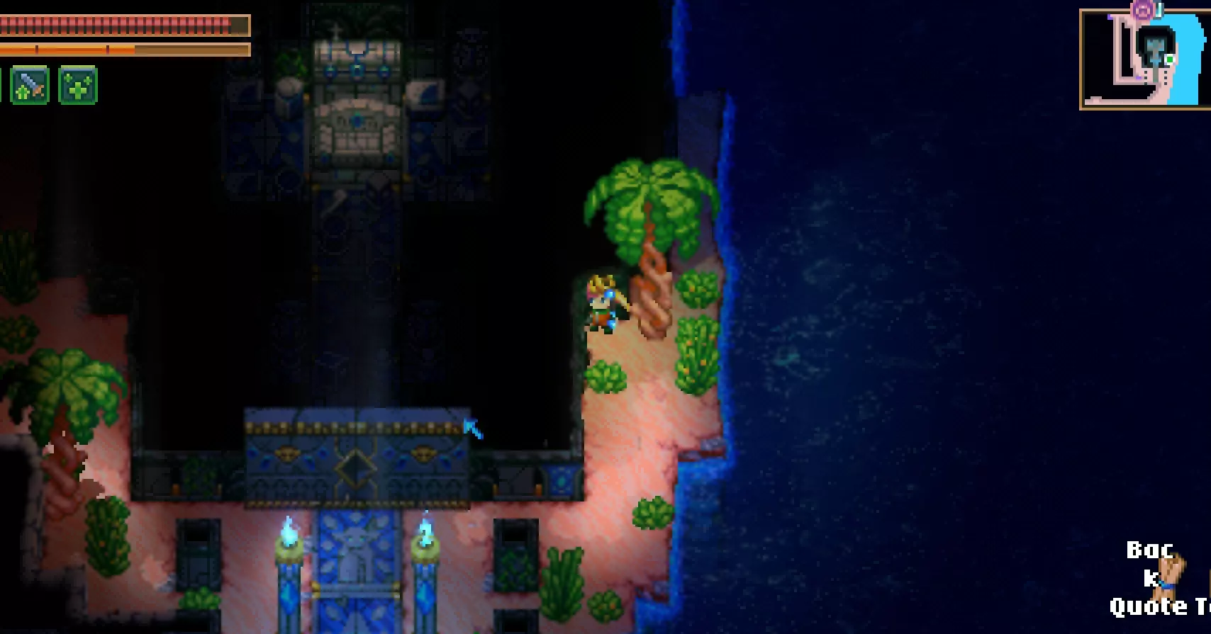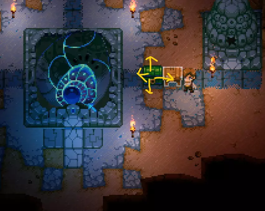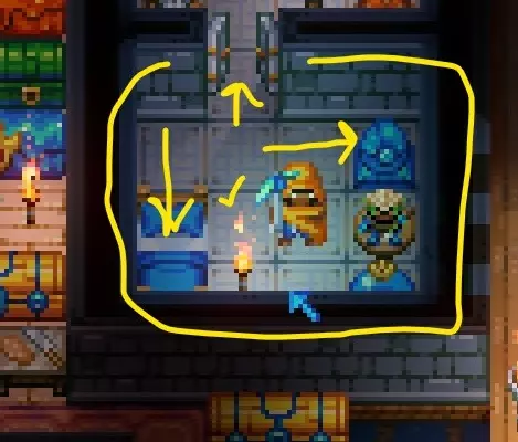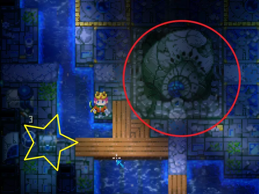 黄色代表泰坦神庙,粉色代表迷宫,白色代表熔岩史莱姆首领,绿色代表沙漠泰坦。 丛林中的封闭门 你可能会遇到无法进入的地方,因为门是关着的,而且墙壁无法破坏。其中一个地方需要手持蓝色光花才能打开,另一个则需要通过音乐打开。