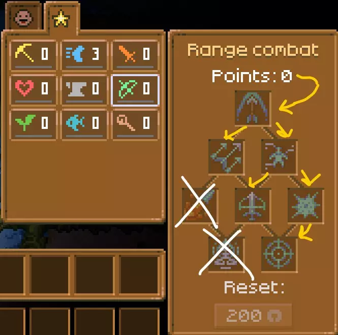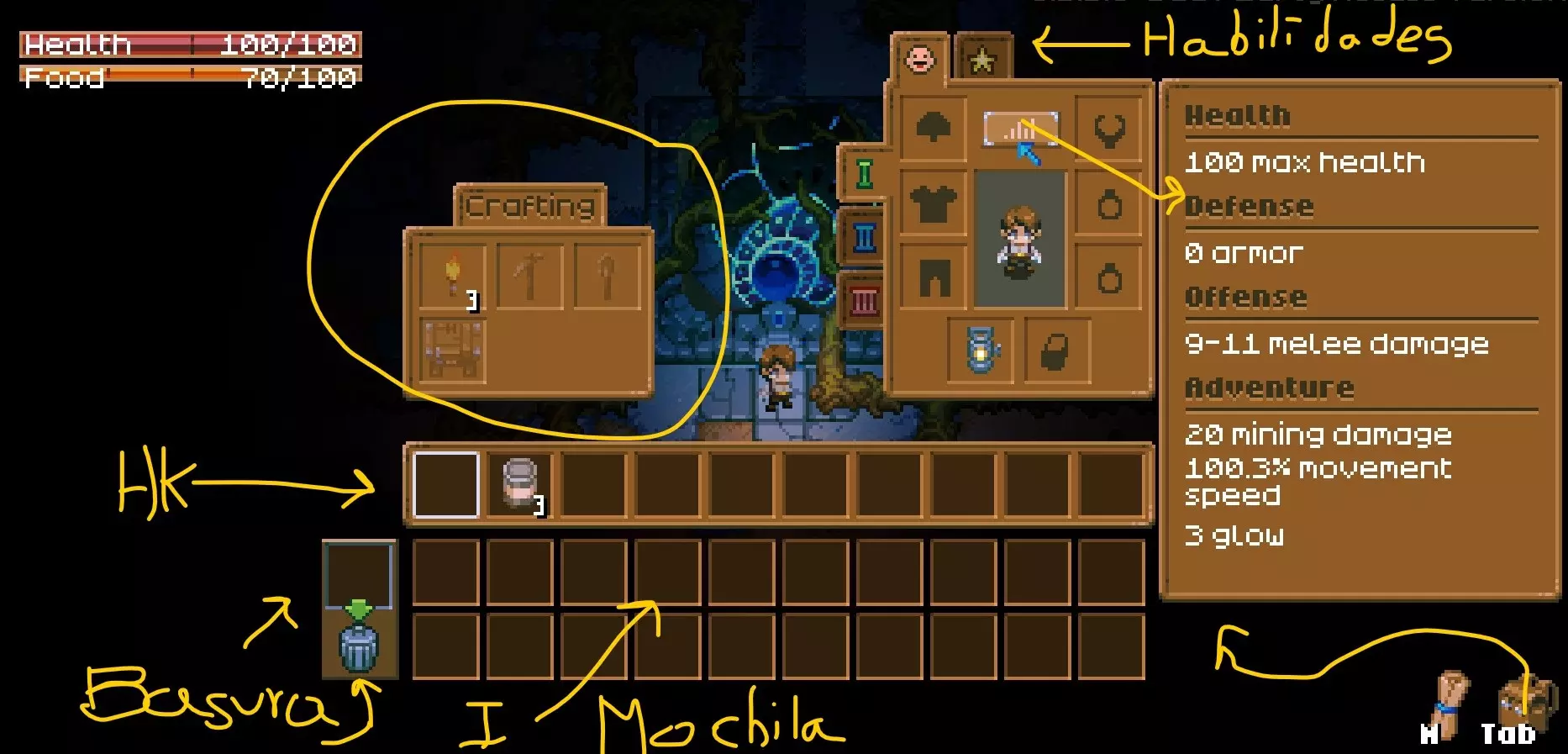 左边是垃圾桶,你把东西放进那个小方框里,点击垃圾桶就能将其永久销毁。 标有“制作”的地方,是你无需工作台就能在任何地方制作物品的功能,只要你的背包、 inventory 或快捷键栏中有所需资源,这些制作通常需要木材。 中间的栏是你的快捷键栏,你可以选择这些物品,然后使用键盘上的1到10键或滚动鼠标滚轮来将它们装备到手中。 右边是你的角色以及可以为其装备物品的槽位。 罗马数字I、II、III用于快速切换装备,例如,可以分别设置战斗装备、挖矿装备、移动速度装备等。点击条形图会显示你的属性,包括护甲值和速度等。这些属性会根据你当前手持的物品而变化(例如,当你选中一把镐子时,采矿伤害会增加;手持剑时,伤害值会有所不同,以此类推)。在上方,你可以点击星星图标查看技能,最高等级为100级,每升一级都需要更多经验值。每提升5级,你将获得1个天赋点,可以在该领域内任意技能上使用,操作比较直观。当在一个技能上投入5个天赋点后,你会看到下方解锁两个选项,依此逐步解锁,但这里有个技巧。