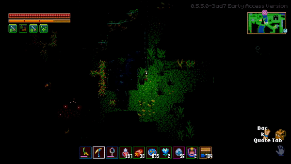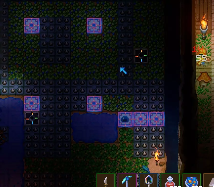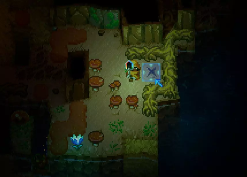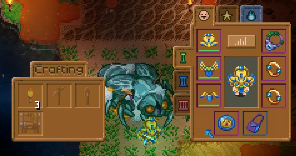 当鱼处于正常状态(黄色)时,按下鼠标按钮将其尽可能向左拉。如果红色条充满(我的图片中的黄色箭头所示),鱼线会断裂,鱼会逃脱;如果鱼到达右侧,也会逃脱。 当鱼处于红色状态时按下鼠标按钮,红色条会填充。如果不按任何键,红色条会非常缓慢地清空,但鱼会继续移动。 每条鱼都有自己的节奏,如果你想成为一名优秀的渔夫,就必须学习它们的声音和活动模式。 钓鱼受到多种数值的影响,包括技能、装备和鱼饵。 有些物品能让鱼更靠近左侧,有些则能减少红色条填充的惩罚,诸如此类。虫子(捕虫网) 你可能会以为看到的那些小虫子和昆虫能用来钓鱼,但其实并非如此,我觉得它们除了卖给商人外没什么别的用处。 鱼饵 你可以用这个工作台将材料制作成鱼饵,制作好的鱼饵可以装备在副手(通常用来拿灯笼或盾牌的位置),从而在钓鱼时获得多种增益效果。 想要更快提升钓鱼等级,我推荐用荧光郁金香制作荧光鱼饵,它能增加钓到物品而非鱼类的几率,让升级过程更高效。 你的小农场 在这款游戏中种植和收获蔬菜很简单。 你只需要一把锄头、水和种子。获取种子的方法:你可以通过击败某些敌人获取它们掉落的种子,探索地点时在某些容器中找到种子,或者收获自然生长的水果/蔬菜来获得种子。 有些种子只能种植在特殊的土地上,例如,金盏花需要种植在石质地基上,西瓜需要种植在沙滩沙地上。 要获取这类特殊土地,你需要一把足够坚固的铲子来挖掘。 你可以在工作台制作锄头,甚至在背包中使用木材也能制作锄头。你的锄头品质越好,可开垦的种植区域就越大。木锄头只能开垦1x1的地块,铁锄头(Iron)能开垦2x2的地块,猩红锄头(Scarlet)则可以开垦3x3的地块。锄头还能让你一次性收割所有地块,加快收割速度。此外,铁锄头或猩红锄头收割地面上的蘑菇和淤泥/苔藓的速度比铲子更快。 拥有锄头后,开垦土地时你会看到土地的外观发生变化,这意味着你可以在那里播种了。 手持种子时,你可以按住鼠标按钮并移动光标,或者移动你的角色来快速播种。要浇灌你的耕地,你需要一个水壶(Watering Can)或猩红洒水器(sprinklers)。手持水壶时,靠近有水的地方点击以装满水,然后前往已开垦的土地,点击即可浇灌那片土地。