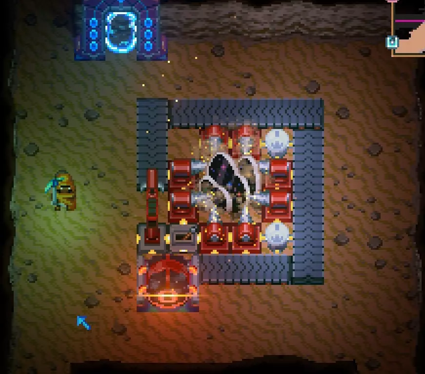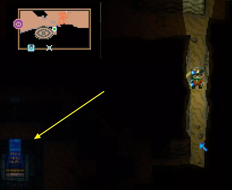 选择它们后,你可以通过按下鼠标中键来标记地图,这样就能标记出你发现的矿物节点(需要猩红钻机才能开采)、首领位置或其他值得探索的有趣地点。 我用橙色箭头指出的符号,是扫描仪显示的首领位置结果。 如果你无法通过径向探索(也就是到处跑、破坏墙壁等方式)找到首领,可以建造一个扫描仪。 击败首领格urch(Glurch),并将其掉落物放置在核心区域北部的结构/雕像中,你将获得制作两个扫描仪的能力,用于寻找蠕虫和蜂巢。