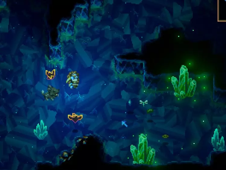 如果你选择其中一条路线,就无法再选择另一条路线。 如果你不满意点数的分配方式,可以花费200金币使用下方的【重置】按钮来清除选择并重新尝试。 角色属性 伤害/攻击(伤害) 分为远程和近战两种类型,没有弹药限制,因此所有远程武器都可以无限射击。说实话,在这款游戏中,近战战斗不如远程战斗出色。 另一种伤害类型是爆炸伤害,它可以破坏墙壁。游戏中有多种火炮和爆炸物会造成这种伤害,但要注意爆炸伤害可能会波及你自己或队友,比如炸弹。最后,我们终于有了采矿伤害这一属性。采矿伤害用于计算你是否能够破坏墙壁。有些特殊墙壁是永远无法破坏的,当你尝试破坏它们时,会被反弹回来。每面墙壁都有最低防御值要求,你需要拥有至少相应数值的采矿伤害才能开采它们。 要查看你的真实采矿伤害,请先装备你最好的镐子,然后查看你的属性面板。 护甲 护甲可以将你受到的伤害(或敌人受到的伤害)减免最高75%。这意味着敌人(以及你)至少总会造成25%的伤害。例外情况是能够减少首领伤害的装备(对首领伤害减免百分比),这将帮助你受到更少的伤害,突破75%的上限。 燃烧伤害不会被护甲减免。 荆棘伤害是当敌人攻击你时你对其造成的伤害。(最好确保敌人无法攻击到你) 闪避率 在我看来,这是游戏中最佳的防御手段,百分比是实际数值,如果你有33%的闪避率,意味着每3次攻击中只有1次会命中你。 移动速度 许多敌人会预示他们的攻击,而首领的攻击也非常容易通过不在攻击目标位置来躲避。你会注意到许多敌人在攻击前会发出白光,这是你尽快离开那里的信号。 亮度(Glow) 这个数值表示你的存在能照亮多少方块,亮度值越高,你在黑暗中向各个方向的视野就越开阔。有多种食物和装备可以为你提供亮度值,亮度值是可以叠加的。如果你有一个+3亮度的灯笼,再吃一份+4亮度的食物,那么你现在的亮度值就是+7。 如果你发现自己很快就被击败,你需要更多的护甲或闪避,最好是两者都有相当的数值。 游戏机制与地图 地图会在你创建世界时生成,你总是从中心位置开始,核心旁边。在这里你会看到另外3个结构,它们代表着前3个 Boss。从这里开始,游戏将以循环模式分配遗迹、宝藏、地牢、生物群系和首领的位置,这意味着游戏没有固定地图,所有内容都是随机且程序化生成的。 我们将角色所占的空间称为1个方块单位。 你的角色移动一个方块单位,然后占据下一个方块单位,以此类推。 该机制的运作方式是:某些地点的出现需要与核心保持最小距离,但具体方向(北、东、西、南)是随机的。