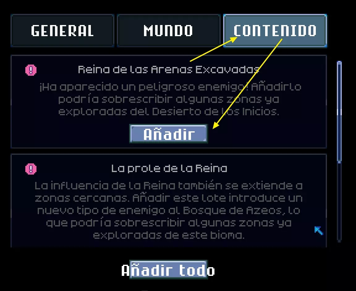 不要把它安装在虫子身上,否则你会死! 虫子的外壳有弱点,当你摧毁这些弱点时,它会分裂成两半,你将面临更多敌人。因此,建议当它分裂成两半时,先攻击较小的部分(分裂出来的部分)直到消灭它,然后重复这个过程。 分裂出来的虫子有电击攻击。要非常小心,不要碰到虫子的身体,它可能一击杀死你。如果你离主要虫子太远,战斗就会结束,你将不得不购买更多柱子……所以要绕圈战斗,尽量不要远离该区域。 对首领的伤害减免似乎不适用于电球造成的伤害,我认为闪避也无效,但对此我不是100%确定。如何更新你的世界以添加新内容 为避免你从零开始重建基地/世界,现在可以通过世界菜单更新你的世界。 此功能仅适用于2024年8月及之后创建的世界,此前创建的世界无法更新。