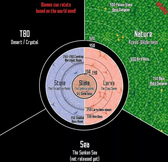 这只是一个示例,你的地图可能会有所不同,而且这张地图也已经过时了。 核心周围会有两个区域:黏土洞穴(Clay Caves)和遗忘废墟(Forgotten Ruins),正如你在上面的地图中看到的,这些区域位于中心圆圈之外:核心和地下层(The Underground)。这是你可以进入的前三个区域。 你在地图上看到的数字是距离核心的方块数,也就是半径。 例如:那里写着【65 Slime Boss】,这意味着第一个敌人(史莱姆 boss,Glurch)距离核心65个方块,但你不知道具体方向! 同样,第二个 boss(吞噬者,一只巨大的蠕虫)会在距离核心250个方块的地方四处移动,这个 boss 很容易被发现……相信我。击败前三个首领(淤泥、蠕虫和蜂巢)后,与核心对话,它会告诉你需要打开墙壁【Touch the Wall】。 在任意方向450格处,有一个石头圆环,你需要先击败3个首领,并将它们各自的魔法物品放入核心周围的3个结构中,以恢复核心的力量,之后才能打破这个圆环。 墙壁被破坏后,你可以进入3个不同的生物群系:海洋【Sunken Sea】、丛林【Azeo's Wilderness】、沙漠【Desert of the lost】。 这三个生物群系的方向是随机的,不一定与地图上显示的角度一致!总之,核心思路是根据与核心的距离,会出现特定的区域,而寻找这些区域时,你应该采用近乎圆形而非网格状的搜索方式。 资源和可探索区域的推进:推动科技发展的主要物品是你的工作台。 第一个工作台很容易制作,使用你从核心周围的树根获得的木材即可。每个工作台都有制作更高级工作台的配方。 因此,目标之一就是利用从新探索区域获得的新资源来制作更高级的工作台。 资源(矿物)的获取顺序如下:木材→铜→锡→铁和金→猩红矿→星彩矿→星系矿。关于生物群系: 地下→黏土洞穴→遗迹→荒野→海洋→沙漠。 需要注意的是,破坏墙壁需要挖掘力,挖掘力会随着更好材料的镐子、你的挖掘技能以及装备而提升。 镐子将是你最重要的工具,只要制作出更好的工作台,你就能制作更高级的镐子。 你必须随身携带的最重要物品之一是火把和桥梁。 火把用于照明和标记走过的路,桥梁用于跨越世界中的溪流、湖泊、河流和坑洞。