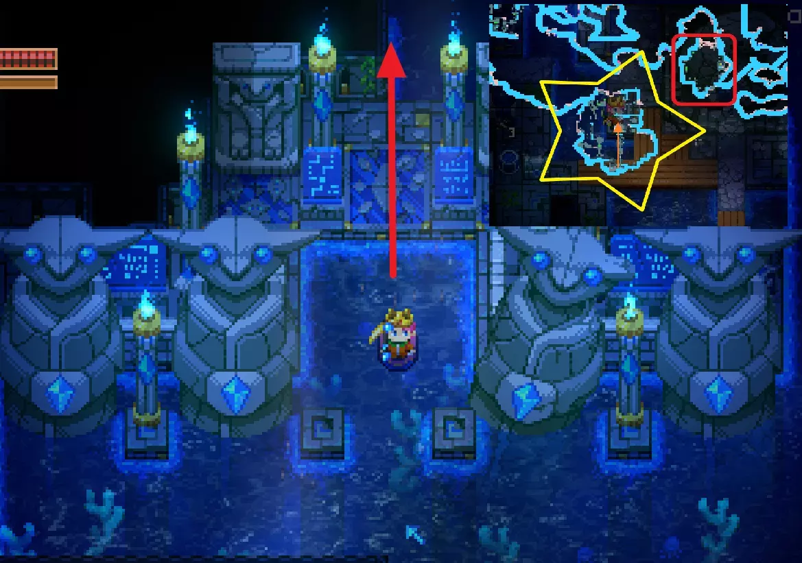 别忘了去寻找并获取宝藏!现在你需要从洞穴人商人处购买一个空水晶,手持该水晶,将从废墟核心获得的三张卡片组合起来,制作出管理员钥匙。将管理员钥匙带到宝库。宝库与大都市相比非常小,但幸运的话,你会看到一道光束下有宝藏(或者两棵棕榈树),那就是你要找的地方。