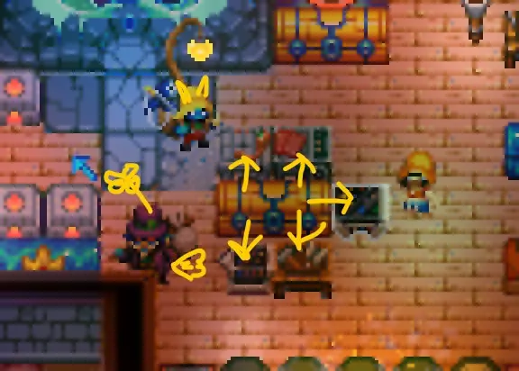 如果你将容器和工作台放在一起(如图所示),就可以使用容器里的物品在工作台上制作东西,这样你就不用把资源装进自己的背包里来制作物品了。 击败第一个首领后,你会获得一个更好、容量更大的容器,你可以用它设计一个高效的工作区,让不同的工作台都连接到这个大容器上。