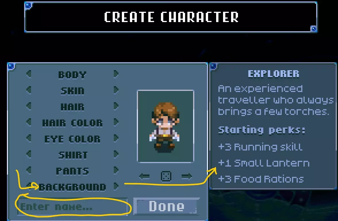 在下方输入你的名字,然后选择你的外观。背景会让你在开始时获得一些物品和角色技能点。对我来说,探险家是最好的选择,因为我喜欢它的手电筒,但矿工也不错。进入游戏后,你可以按TAB键打开你的物品栏和角色面板。