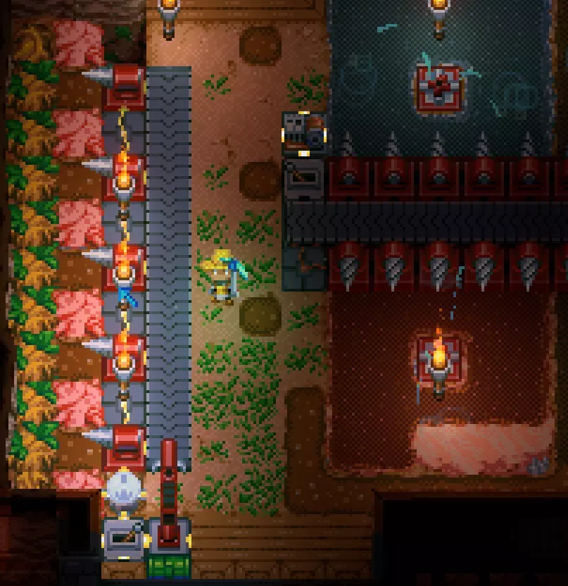 由于树根和珊瑚只会向侧面生长,利用这一点,每当木材生长时,钻孔机就会将其破坏并输送到传送带,传送带会将掉落的木材运送到机械臂旁边,机械臂随后将其拾取并放入容器中。机械臂总是从其正前方的格子获取物品,并将物品移动到其正后方的格子。