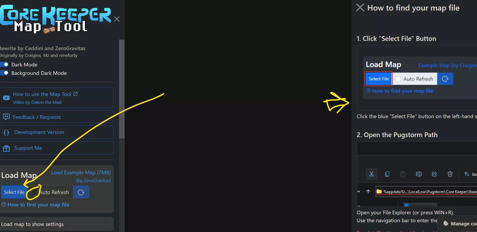 右侧是使用教程,左侧是界面。点击我左侧箭头指示的按钮,你将加载地图。《核心守护者》的地图位于:【用户】AppData LocalLow Pugstorm Core Keeper Steam 121733774 maps 0。请将【用户】等替换为你的名称。