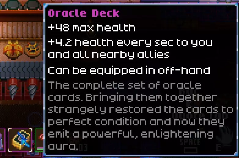 其他内容 水晶陨石 在沙漠中,你可以找到这个水晶地点,如果你打碎八块水晶并将它们在手中激活,你将获得一个副手物品,它会降低你的护甲,但会增加你和盟友的伤害(和卡牌一样,我认为如果每个人都装备一个的话会叠加)