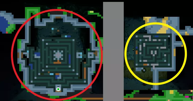 这张图片是中型迷宫和小型迷宫的对比,你要找的是左边那个。 有很多方法可以获得破损手柄,许多首领的宝藏中都会掉落。 碎裂之刃更难找到,它所在的小型神庙位于丛林中一个隐蔽的基座上,很难被发现。我花了4个小时寻找它,直到意识到自己其实早就找到了,只是当时没注意到!