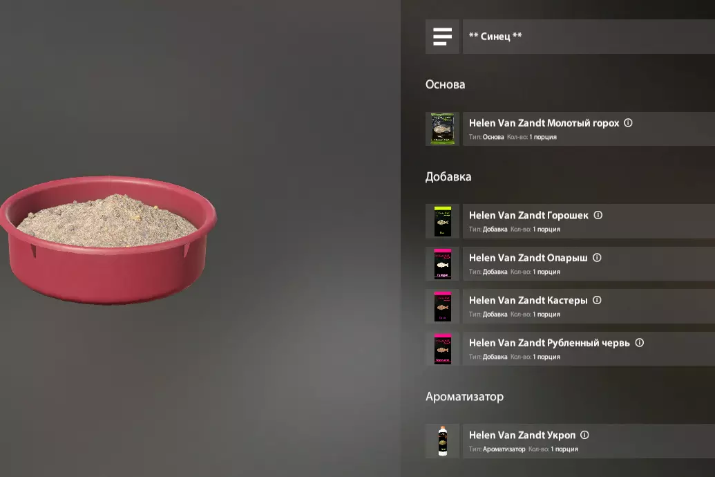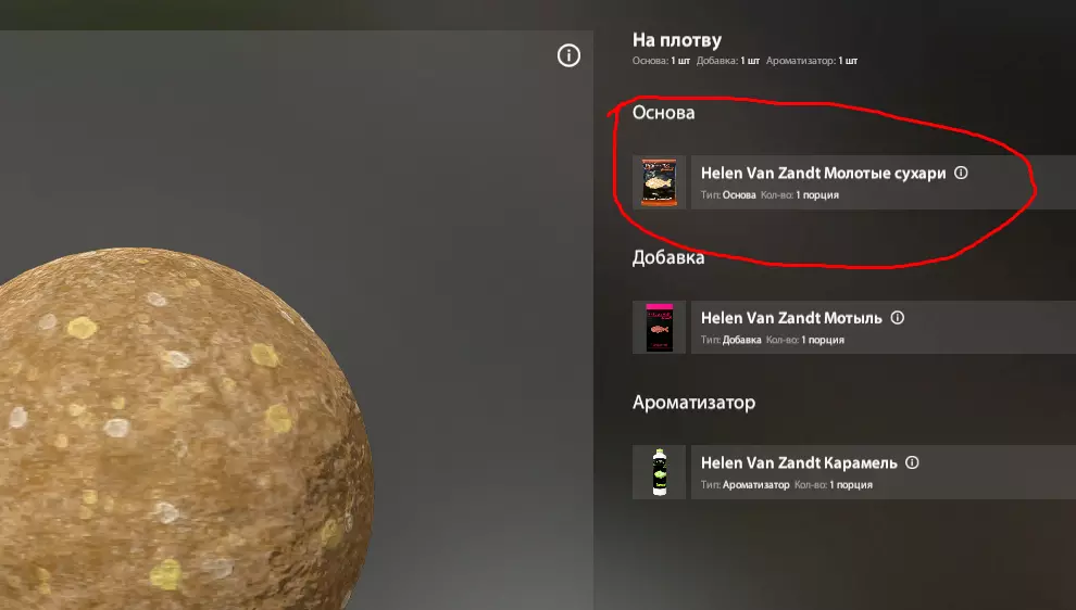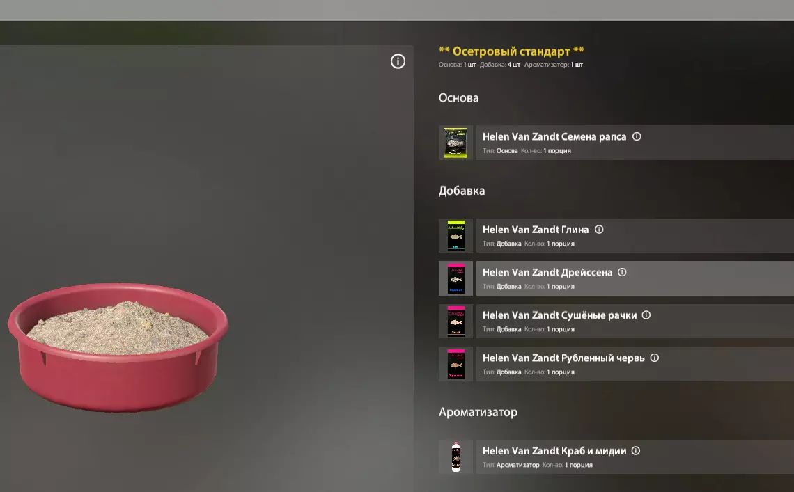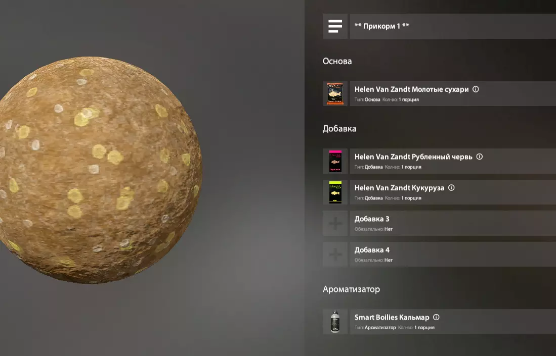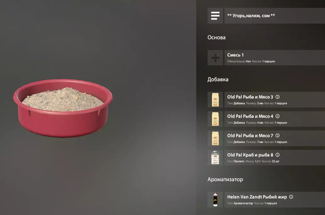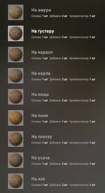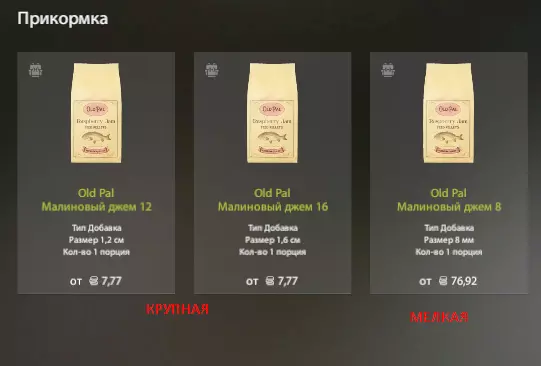 游戏中几乎所有的饵料口味都对应着商店里2-3种口味的诱饵颗粒。我们通常会添加3-4种成分,一般是碎饵料,或者与我们的钓饵口味相同的小颗粒。一切都相当简单。在这种情况下,我们既可以在3种商店购买的现成颗粒中添加碎饵料,也可以使用钓饵部分的这种颗粒。