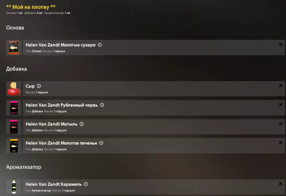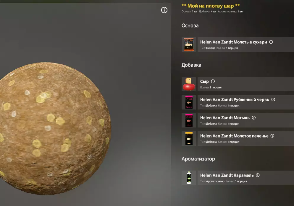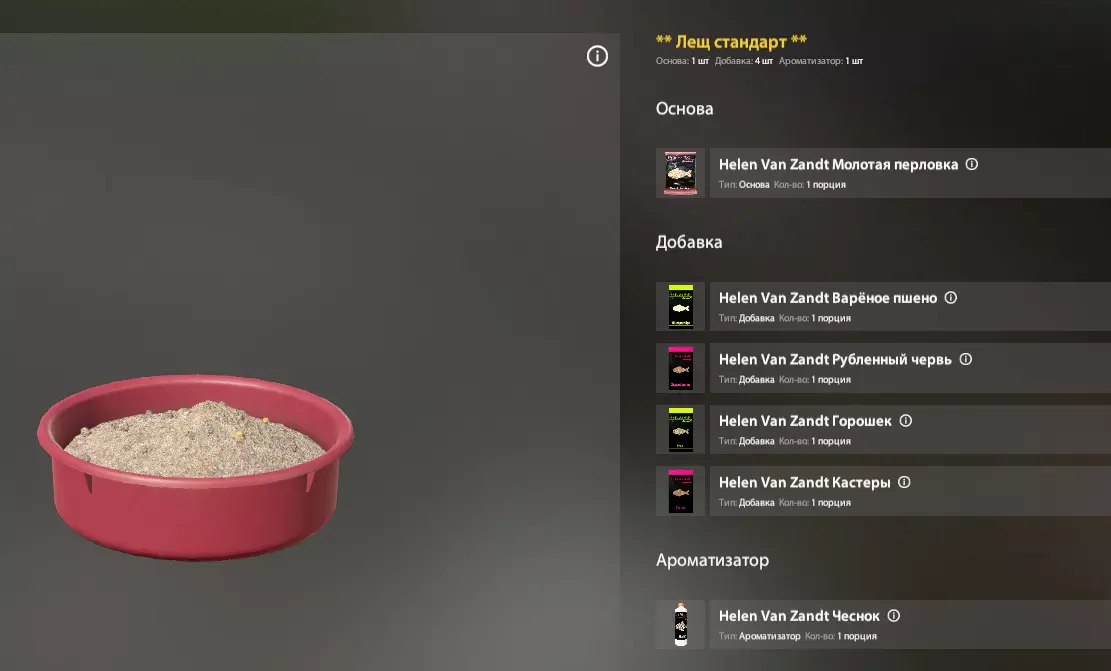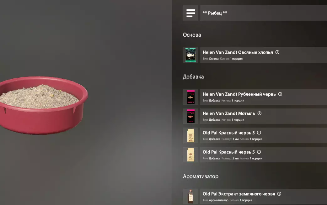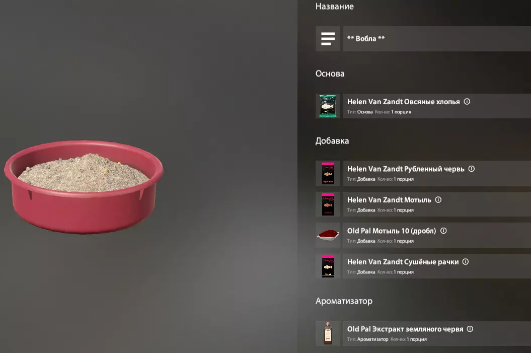 我们会从模板中获取基础和部分组件,但其他组件从哪里获取呢? 这款游戏是钓鱼模拟器,这意味着现实生活中鱼类的口味偏好也适用于游戏中。 这意味着,在搜索引擎中输入“欧鳊鱼饵”,我们同样能找到游戏中可用的完整鱼饵配方,或者至少能了解这种鱼的口味偏好。 以下是我制作欧鳊鱼饵的例子: