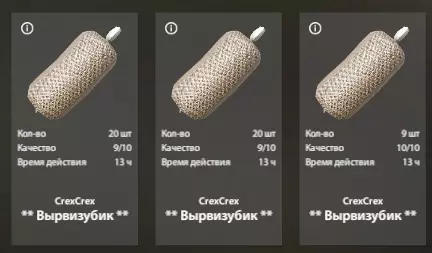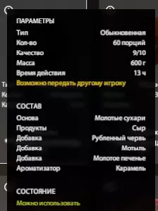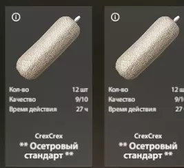 投入5点后,制作时获得的标准鱼饵为9/10,高运气时会出10/10,通常每4-5次搅拌出一次,但也取决于材料品质。鱼饵的总体品质会影响其对鱼的吸引力。也就是说9/10的诱饵会输给10/10的诱饵。诱饵的吸引力受诱饵组件的质量影响。例如,在诱饵中使用食品店的奶酪,其质量为一颗半星。