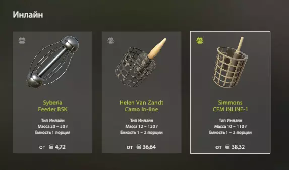 还有来自新年集市的内置喂食器。关于这款游戏中的喂食器,最好根据伪装的土壤类型来选择。最好选择适合黏土的,容量为2个球的喂食器(在我看来,这样消耗适中,喂食效果也不错)。直列式饵架的特点是搭配直列式钓组使用,这种钓组适用于静水垂钓(例如在洄湾处钓欧鳊),并且直列式铅坠和饵架具有更好的自动刺鱼效果。不过,如果是作为远投专用铅坠,我还是不建议使用,它们抛投大饵团时表现不太好。如果钓点风力较大,它们的抛投效果会很差,还容易偏离方向,抛投性能明显不足。沉水喂食法,用于在静水中钓鲤鱼,本质上与内联喂食器相同,只是用于鲤鱼钓组。这种钓法的优点只有高灵敏度,但我还是建议使用鲤鱼坠钓法。坠子和PVA水溶网,干饵料可以用专用投饵器投到水中,能够将大量饵料投送到远距离。火箭填充有干燥混合物。落入水中时会产生巨大噪音,可能会吓跑鱼。火箭类型: