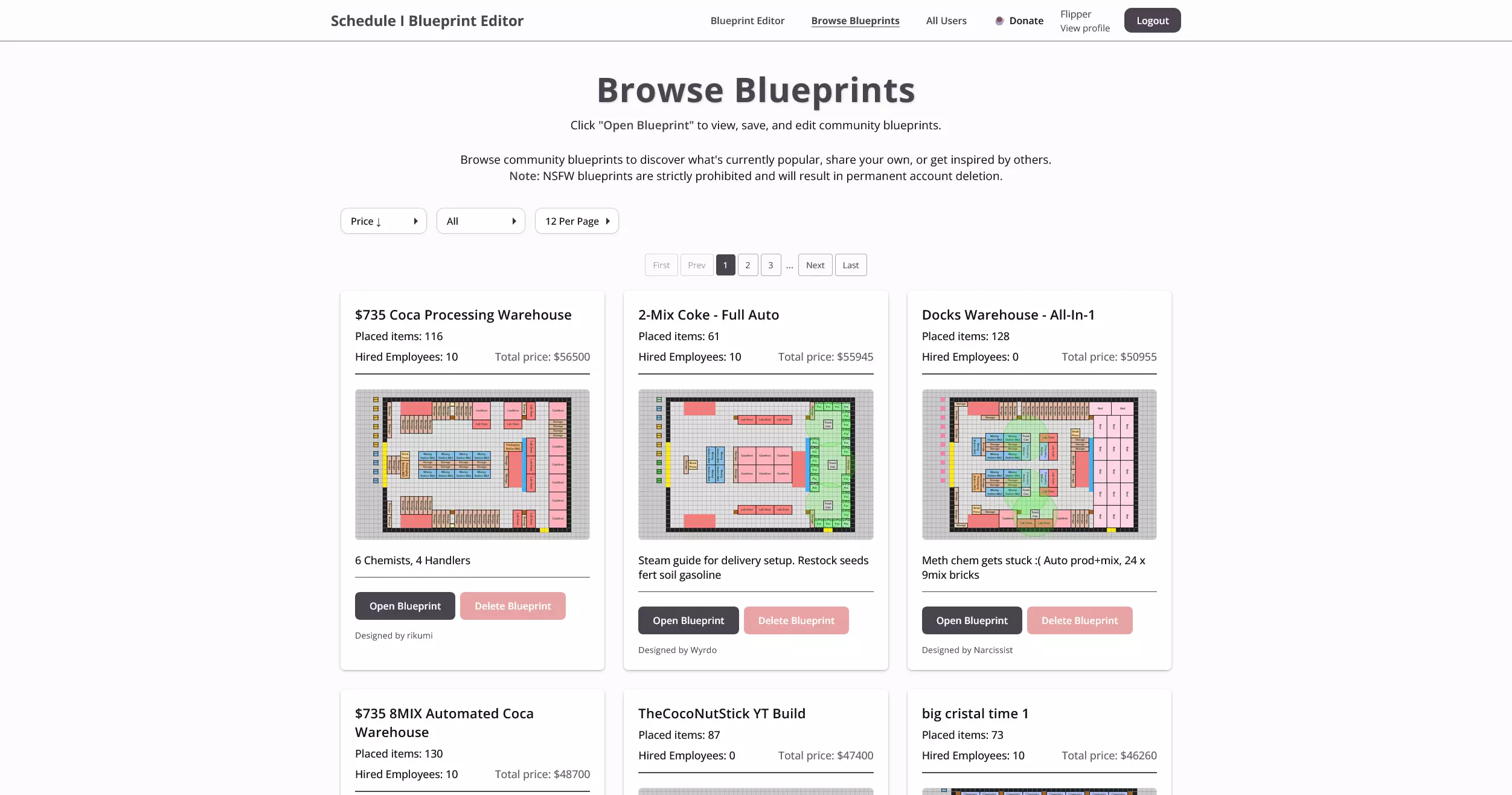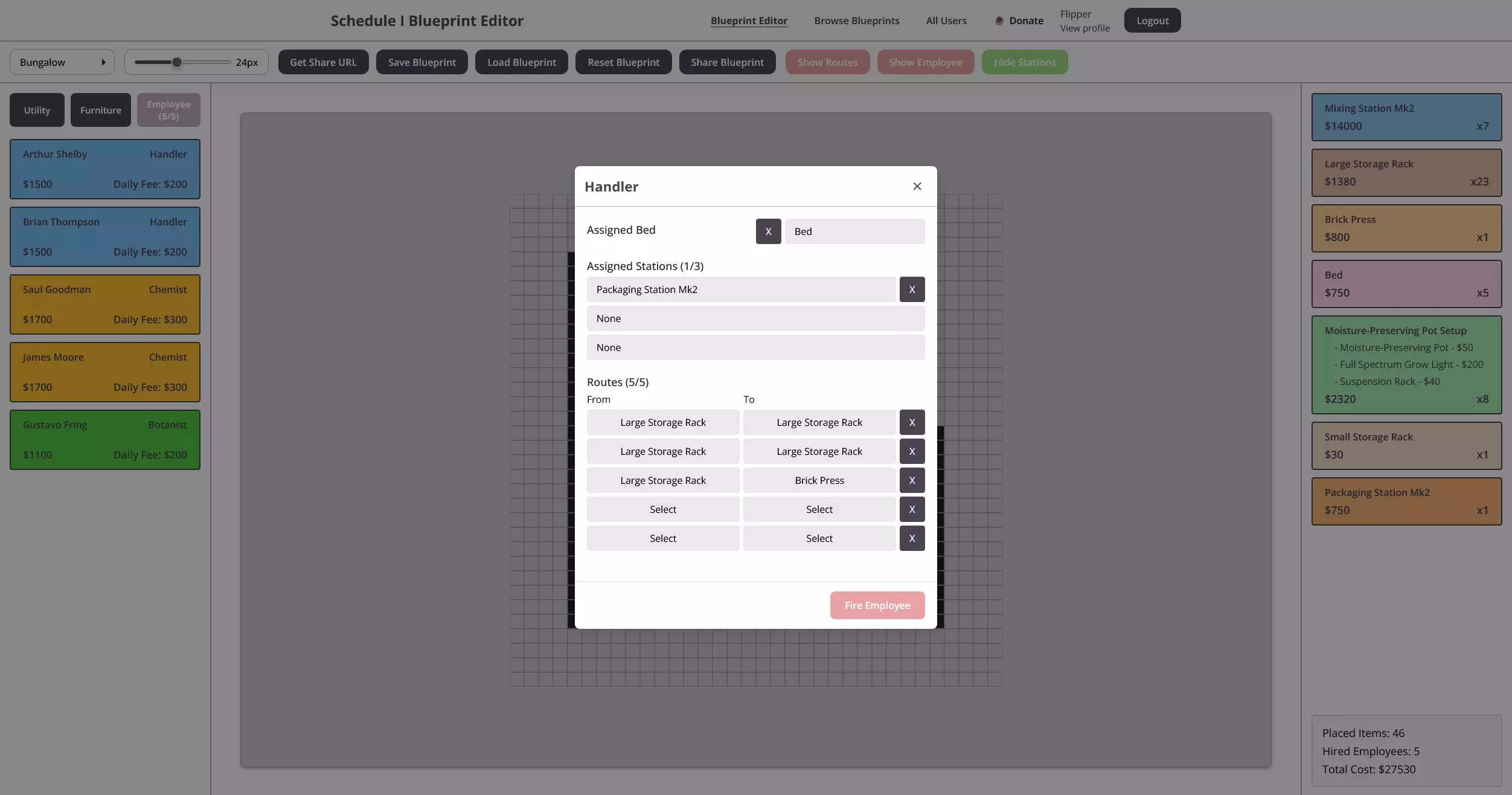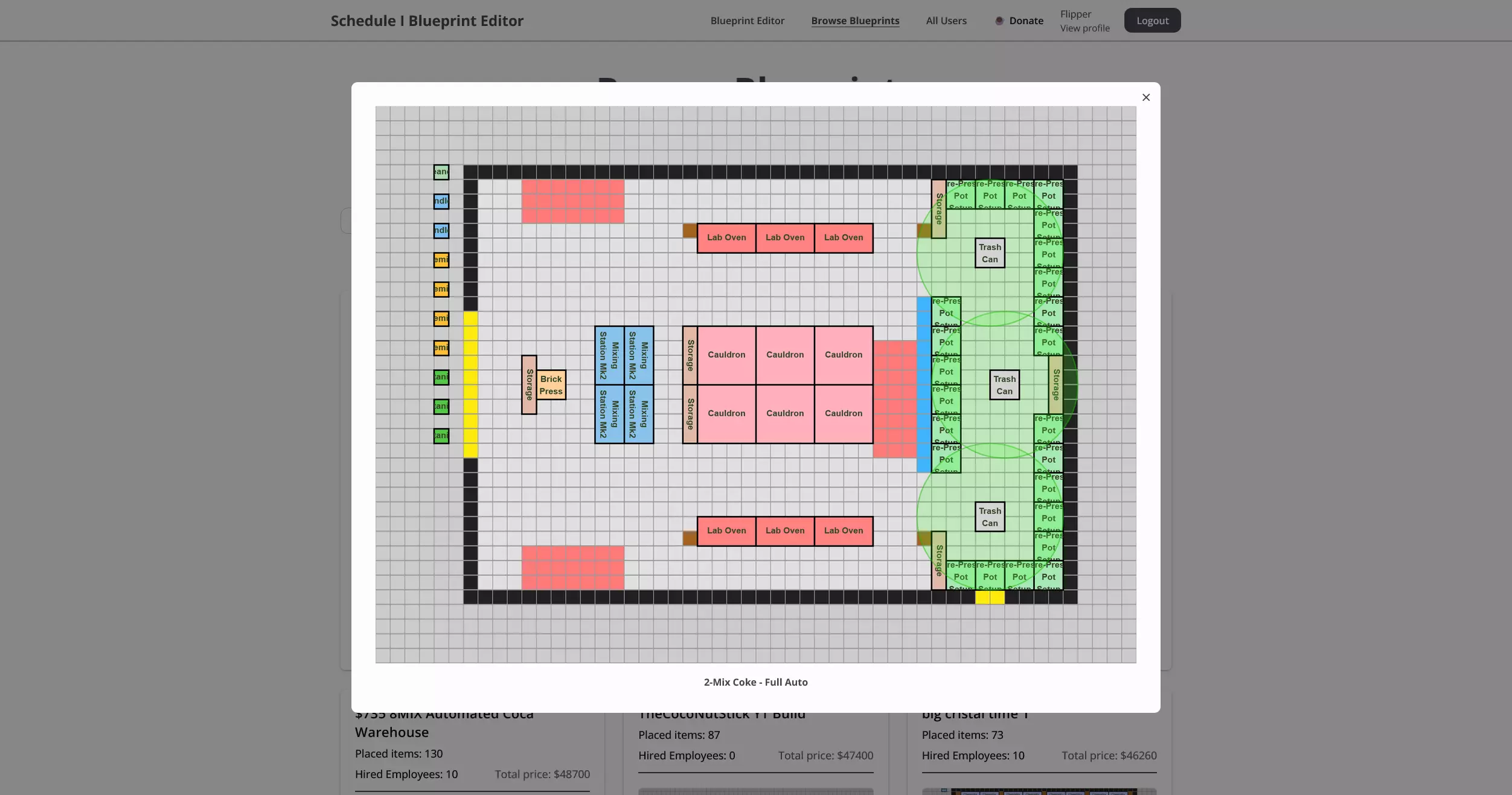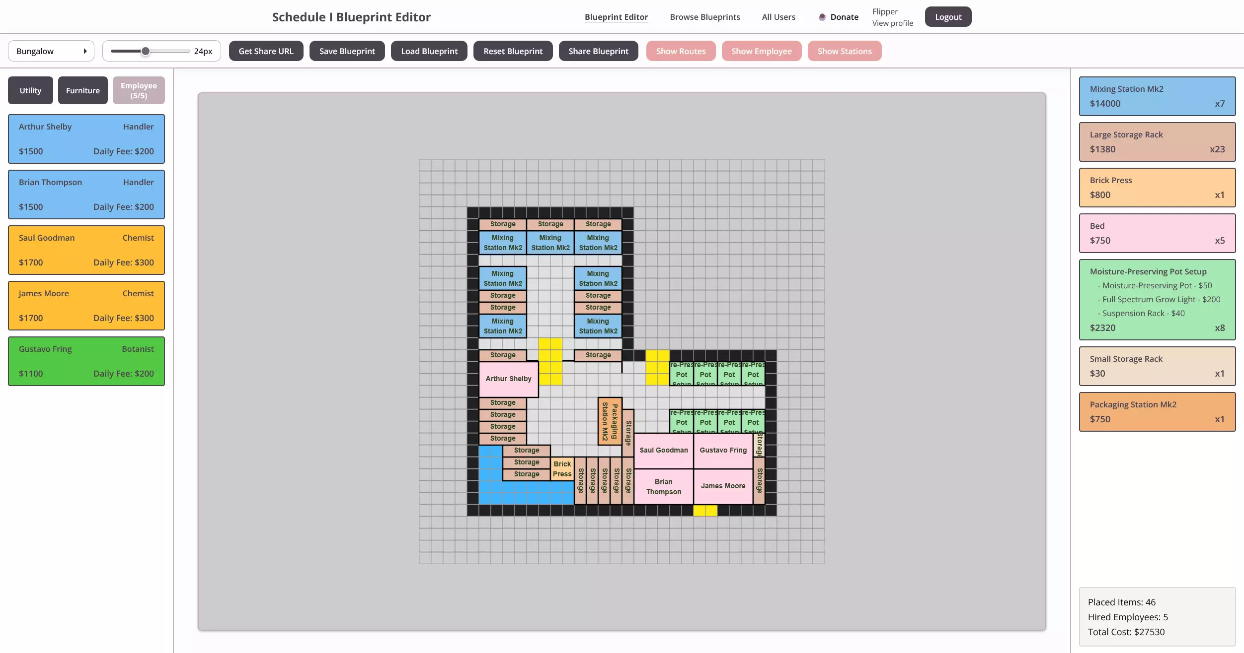 使用蓝图编辑器创建、保存和分享自定义地产布局,其中包含成本估算、物品数量和社区分享功能。 蓝图编辑器 在《Schedule I》中,你的地产可以说是整个运营的核心——这是你将花费大部分时间的地方。从生产、存储到制造,一切都在这里进行。考虑到这些空间在游戏玩法中的核心地位,拥有一个精心设计、规划完善的基地,对你建立帝国时的效率和整体成功将产生巨大影响。 为了简化这一过程,我创建了《Schedule I》蓝图编辑器——这是一款基于浏览器的工具,可让你在游戏中着手建造地产之前,对其进行设计、规划和优化。编辑器会为你清晰展示总成本和所需物品,是尝试布局并找出最有效空间利用方式的理想工具。 它也是发挥创意的好方法:保存你喜爱的设计,探索新的布局思路,或与社区分享你的蓝图。你可以用它来尝试想法,浏览其他布局获取灵感,或向社区分享自己的作品。 注意:目前触屏和小型设备(如平板电脑或手机)功能已禁用,以便我清理用户界面并改进功能。由于建筑系统是定制的,我还未考虑到触摸输入——对此深表歉意! 功能概述 以下是Schedule I蓝图编辑器功能的简要介绍。以下是该工具实际运行的图片展示——从布局构建到社区分享。 主要功能: 【构建与设计布局】 使用灵活的定制建造系统,为所有房产创建布局。 【保存、加载、导出与导入】 轻松将你的创作本地保存,稍后重新加载,或与好友分享/导出。 【成本与物品概览】 即时查看建造的预估成本,以及所用物品的总数。 【社区板块】 与其他玩家分享你的蓝图,浏览他人的设计并获取灵感。 (注:上传和分享需要账户。)快捷键: R – 旋转所选物体 Ctrl + 左键点击 – 快速放置多个物体 鼠标中键点击已放置物体 – 复制该物体 Ctrl + Shift + P – 打开快速访问物品菜单