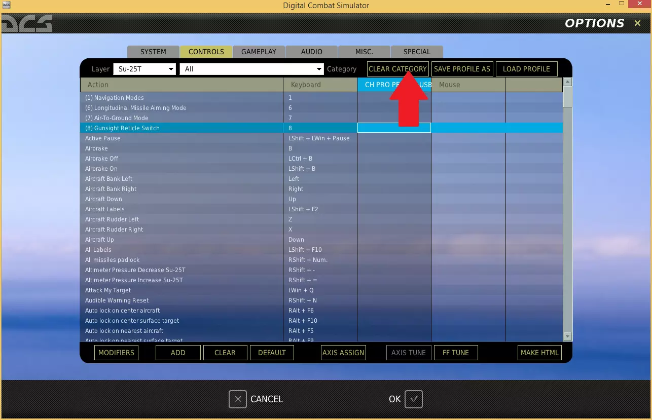 此区域可用于配置摇杆的模拟轴,例如俯仰和横滚。 最左侧的列标题为【操作】,它对应着在DCS中按下按钮或移动摇杆时所发生的动作,这些动作会在同一行的其他列中列出。这非常方便,因为它允许我们将多个摇杆分配为执行相同的功能。这也意味着我们可以保留键盘和鼠标的控制设置作为备用(有时在飞行时,如果需要一只手操作摇杆,另一只手按键盘按钮会更方便)。如果你使用的是HOTAS,你可能会注意到有一个摇杆列和一个单独的油门杆列。在这里你至少应该能看到另外两列,分别是键盘和鼠标,希望还有一个你的摇杆对应的列(如果没有摇杆列,请先确保摇杆能在《数字战斗模拟世界》之外正常工作,如第一部分所述)。 在摇杆列中可能已经有一些默认的按键分配(通常都不正确),所以我们先清除它们,然后进行自定义设置。 点击摇杆列中的任意位置以选中该列。 点击【清除分类】按钮以清除整个摇杆列的设置。