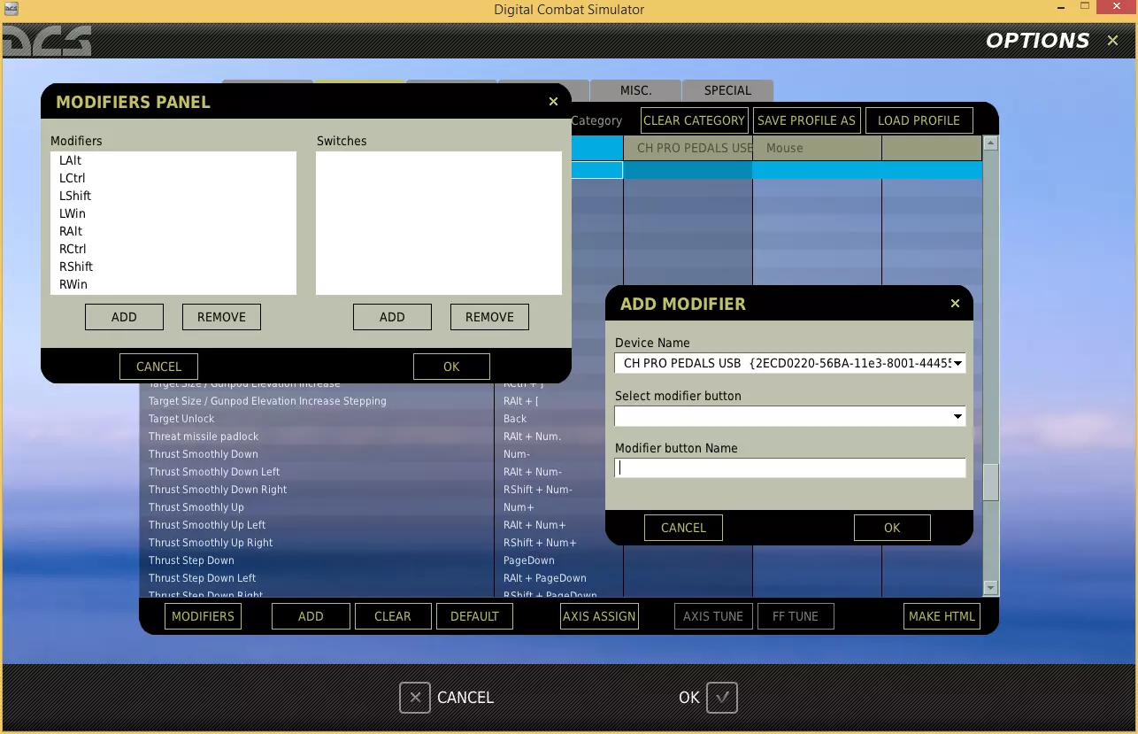 你也不必使用键盘来设置修改键,你可以将任意摇杆上的任意按钮设为其他任意摇杆上任意按钮的修改键。例如,你可以将摇杆上的某个拇指按钮专门用作所有其他摇杆按钮的修改键。这样所有操作都触手可及,也容易记忆。但首先你需要将该按钮添加到修改键列表中,具体操作是点击选项/控制界面左下角的【修改键】按钮。