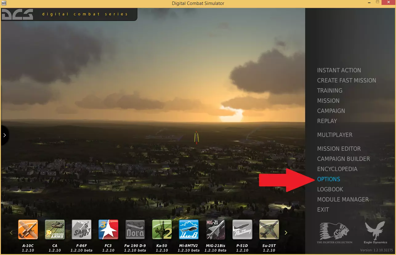 如果这里一切正常,那么我们就可以进入DCS World了。 DCS设置 现在我们需要进入DCS的控制设置页面,然后选择我们想要配置的飞机。 首先,请确保在启动DCS World之前已插入你的摇杆(否则摇杆将不会显示在选项菜单中)。 启动DCS World单人模式 从主菜单中,点击【选项】