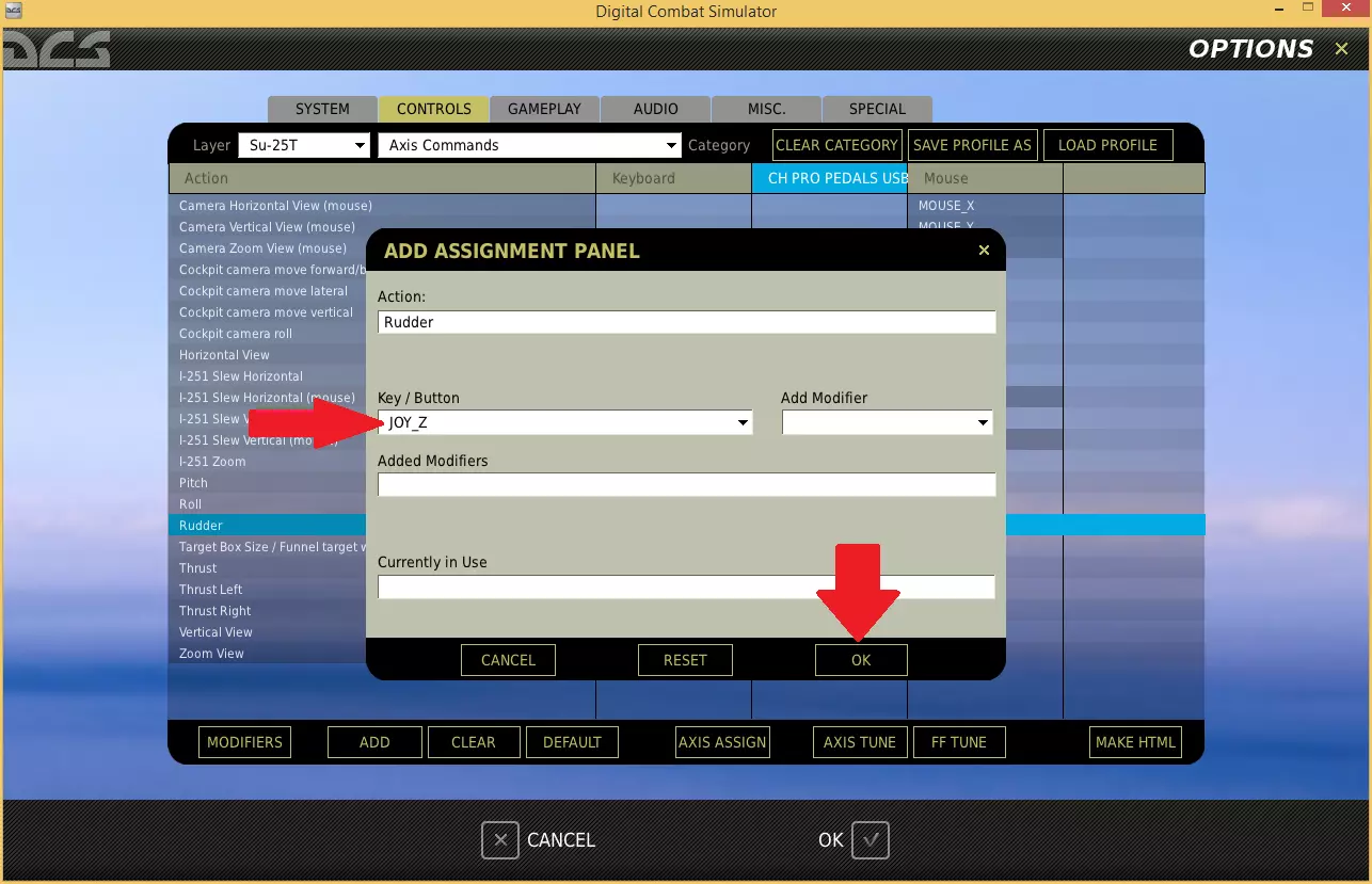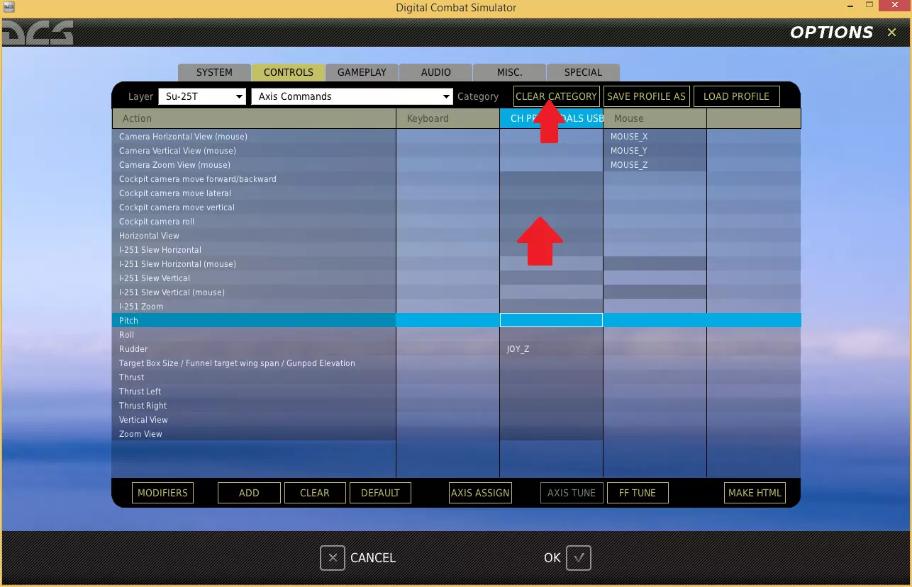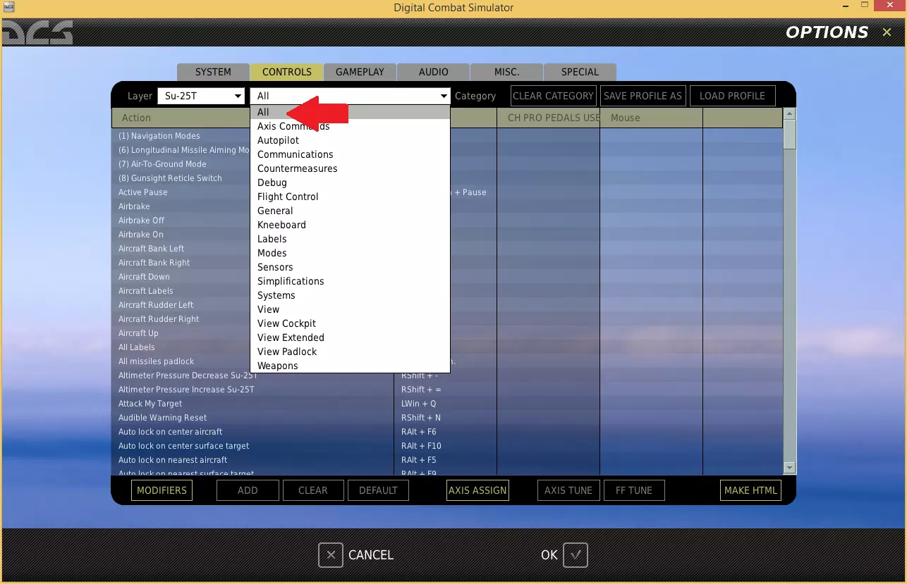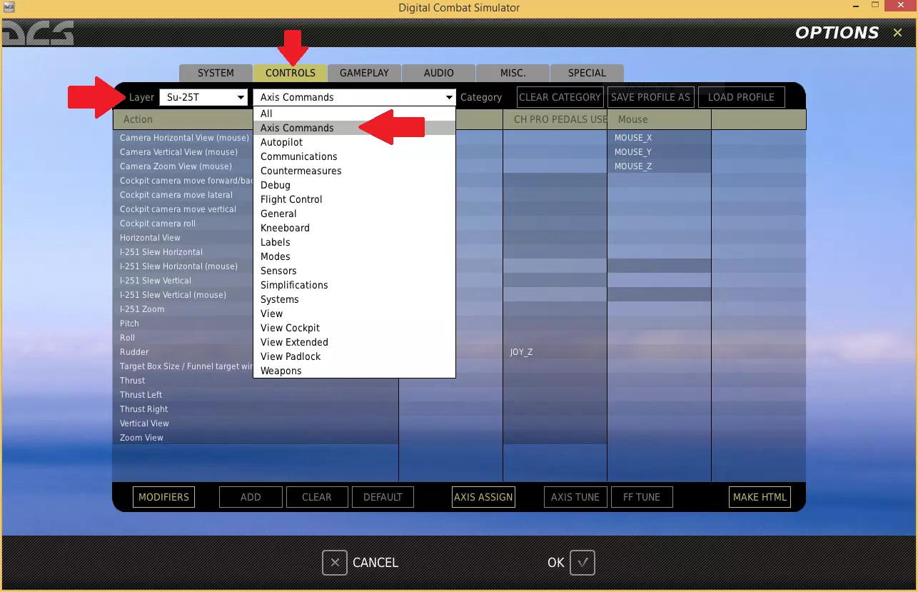 在选项菜单中点击控制选项卡。 使用层级下拉菜单的第一个框选择你想要配置的飞行器(我正在使用Su-25T蛙足)。 通过层级中的第二个框,我们可以筛选想要查看的控制类型(因为可能有数百个我们不感兴趣的选项)。 轴命令 在第二个层级下拉框中,选择轴命令。