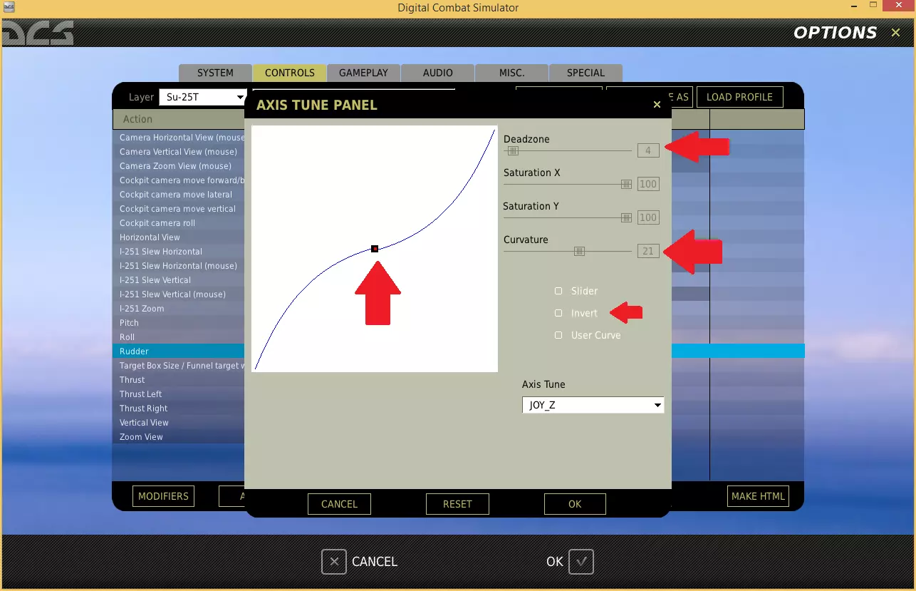 (如果以下内容都无法理解,通常将曲线设置在15-30之间即可,但也可以尝试不同数值以获得合适的感觉) 这条蓝色直线表示,当我们在现实中向前或向后推动操纵杆时,游戏或飞机内的虚拟操纵杆会在整个移动过程中移动相同的距离,呈现1:1的移动比例。 除非你使用的是极其逼真的操纵杆,否则1:1的移动比例通常会导致飞机反应过于灵敏或不稳定。因此,我们需要在蓝色直线上添加曲线,这样当我们移动现实中的操纵杆时,飞机内的虚拟操纵杆移动幅度会相对较小。这会让你感觉操纵杆的行程更长,从而获得更精细的控制。我想你可以说它给你一种阻尼效果。 对于俯仰和横滚,我们需要将曲率滑块向右移动,设置约20的曲线。 此屏幕还通过红点显示真实摇杆的位置,以及黑方块指示虚拟摇杆的最终位置,来让你大致了解效果。 对于方向舵,我们需要将曲率设置为约30到40。 我们还需要设置一个小的死区。死区顾名思义就是轴上的一个区域,在你将摇杆拧动到足够远,使黑方块不再位于死区内之前,虚拟摇杆不会做出反应。 如果你将死区设置为约15,你应该会看到图表中蓝线的中间现在有一条非常平坦的线。不过你只需将其设置为最大约5,或者刚好足够让你在俯仰和横滚操纵杆时不会意外输入方向舵指令。你可以在此屏幕上进行测试,将死区设置得尽可能小,以便在你移动操纵杆模拟横滚和俯仰时,黑色方块能保持在死区内。这样,你只有在真正想要使用方向舵时才会进行操作。 在同一个窗口中,我们还可以勾选反转复选框,如果出于某些原因操作反应与预期相反的话(方向舵踏板和滑块有时需要勾选此选项)。 从技术上讲,现在你已经可以开始飞行了,但设置一些常用的操纵杆按钮也是值得的。按钮、开关和 hats(苦力帽) 我们已经映射了俯仰、横滚、方向舵和推力控制,这些可以让我们驾驶飞机,但DCS World是一款战斗模拟器,所以让我们设置一些用于开火的按钮,以及一些其他便于随手操作的按钮。 首先,我们需要显示所有按钮控制。 在选项/控制界面的左上角,点击第二个“Layer”下拉框并选择“ALL”。