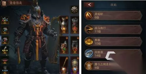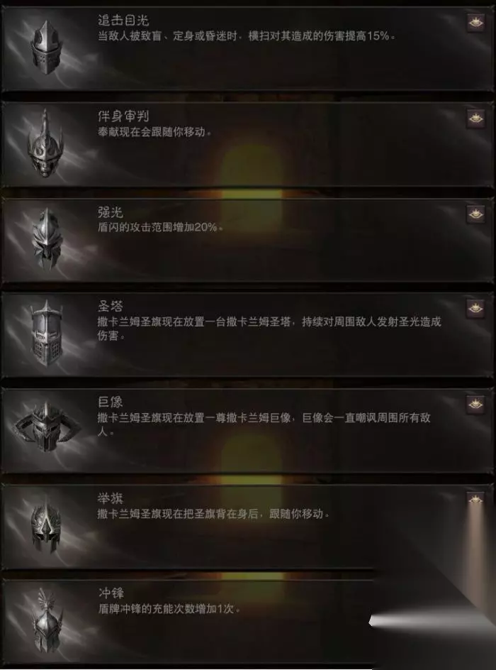 横扫: 1.敌人致盲、定身、昏迷时提升所受伤害(头盔) 2.攻击周围所有敌人(主手武器) 3.将敌人拉到身边(主手武器) 4.持续伤害(主手武器) 回旋盾: 1.伤害提高(胸甲) 2.持续伤害并造成减速(副手武器) 3.围绕自身旋转并造成伤害(副手武器) 4.多次弹射(副手武器) 5.命中后爆炸(副手武器) 盾闪: 1.范围增加(头盔) 2.伤害提升(腿甲) 3.攻击周围所有敌人(副手武器) 4.引导圣光反射攻击敌人(副手武器) 天罚之剑: 1.施放后所有伤害提升(肩甲) 2.附带锁链将敌人拉到身边(主手武器) 3.召唤剑刃风暴持续伤害,不再位移(主手武器) 4.持剑突刺(主手武器) 5.可蓄力施放冲击波(主手武器) 战马拖行: 1.持续时间增加(肩甲) 2.呼唤远程打击周围敌人(胸甲) 3.与队友共同骑行(腿甲) 4.冲撞敌人而非拖行敌人(腿甲) 5.变成火马点燃敌人,但不拖行敌人(腿甲) 奉献: 1.跟随移动(头盔) 2.范围增加(胸甲) 3.附加减速(副手武器) 审判: 1.召唤审判骑士(肩甲) 2.召唤引力法阵,将敌人吸向中心(肩甲) 3.伤害提高(胸甲) 撒卡兰姆圣旗: 1.变成圣塔,对周围发射圣光(头盔) 2.变成巨像,嘲讽周围敌人(头盔) 3.可背在身后跟随移动(头盔) 盾牌冲锋: 1.充能次数+1(头盔) 2.碎裂冲击造成进阶伤害(胸甲) 3.可蓄力提升范围和伤害(腿甲) 4.形成盾防阵,阻挡怪物移动同时抵挡远程投射(腿甲) 神圣之链: 1.连携伤害(肩甲) 2.造成冰冻效果(肩甲) 天谴: 1.将敌人拉向中心(胸甲) 2.范围增加(腿甲)