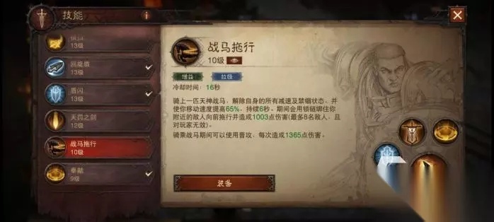 传奇装备属性皆与技能相关,能够得到加强的有关技能如下: 横扫:挥舞链枷对前方范围敌人造成伤害,通过蓄力可以增加伤害和攻击范围,这也是独一无二的主手武器技能。 回旋盾:向前扔出盾牌对沿途敌人造成伤害,回收盾牌还将敌人拉回面前。 盾闪:盾牌发光对前方敌人造成伤害,并造成3秒致盲效果。 天罚之剑:在指定地点召唤圣剑对周围敌人进行伤害,再次激活技能可进行位移,直接从天而降到圣剑位置进行范围伤害。 战马拖行:骑上战马,解除自身减速与禁锢的debuff,提升移动速度并用锁链拖行附近敌人,过程中可以进行普攻。这是该职业最特色的聚怪技能。