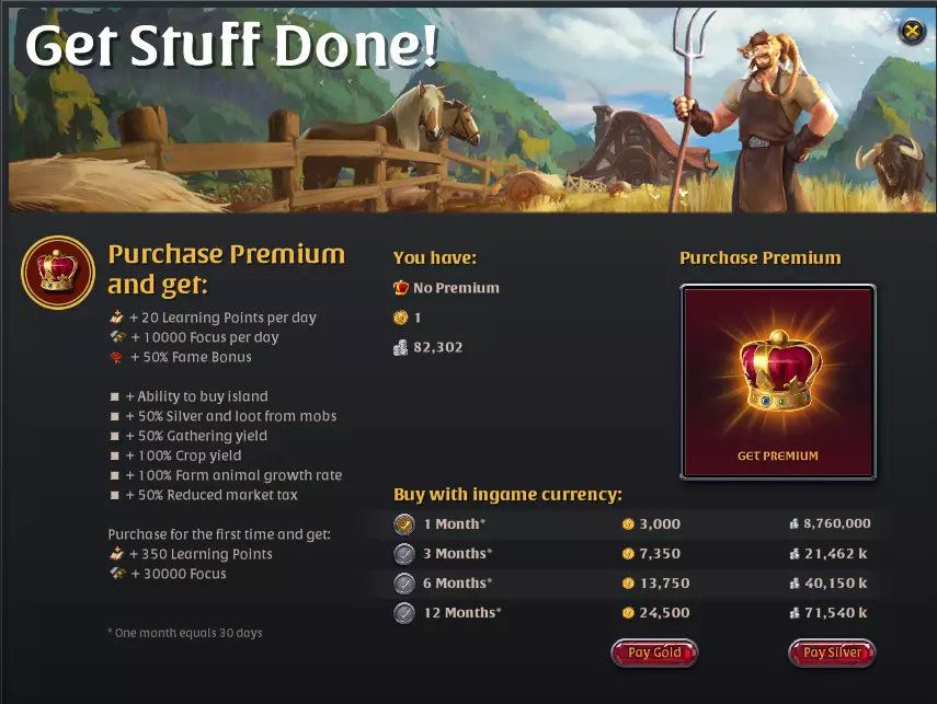 上图是腐蚀地下城的示例。 重要提示:请仔细阅读此提示,因为它确实非常重要……请注意你进入地下城的区域。因为每个地下城中很可能会有对你发起攻击的人。例如,如果你在蓝色区域的某个地下城中被攻击,他们无法杀死你。但如果你在红色区域被攻击且毫无准备地被抓住,你将失去所有东西……要了解哪个区域安全或哪个区域危险,请阅读指南中的【游戏地图】部分。 什么是高级会员?有什么作用? 高级会员是游戏中相对于普通玩家的一种特权。但不要因为我说特权就将游戏视为付费赢(P2W)游戏。高级会员只会加快你在游戏中的进度,不会直接给你提供力量。因此它并非付费获胜(P2W)。一个优点是高级会员并非只能用真实货币购买。是的,在我们看来它价格不菲,但您也不必非得付费。如果愿意,您也可以在游戏中通过积累游戏货币来购买高级会员。我添加的图片中也写了用游戏货币购买需要多少……