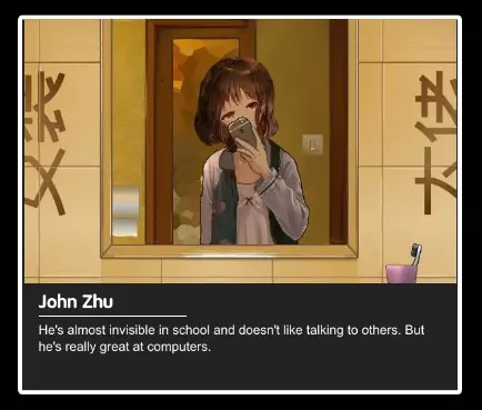 约翰·朱 性格 - 温柔害羞 兴趣 - 电脑和动漫 解锁方式 - 初始解锁